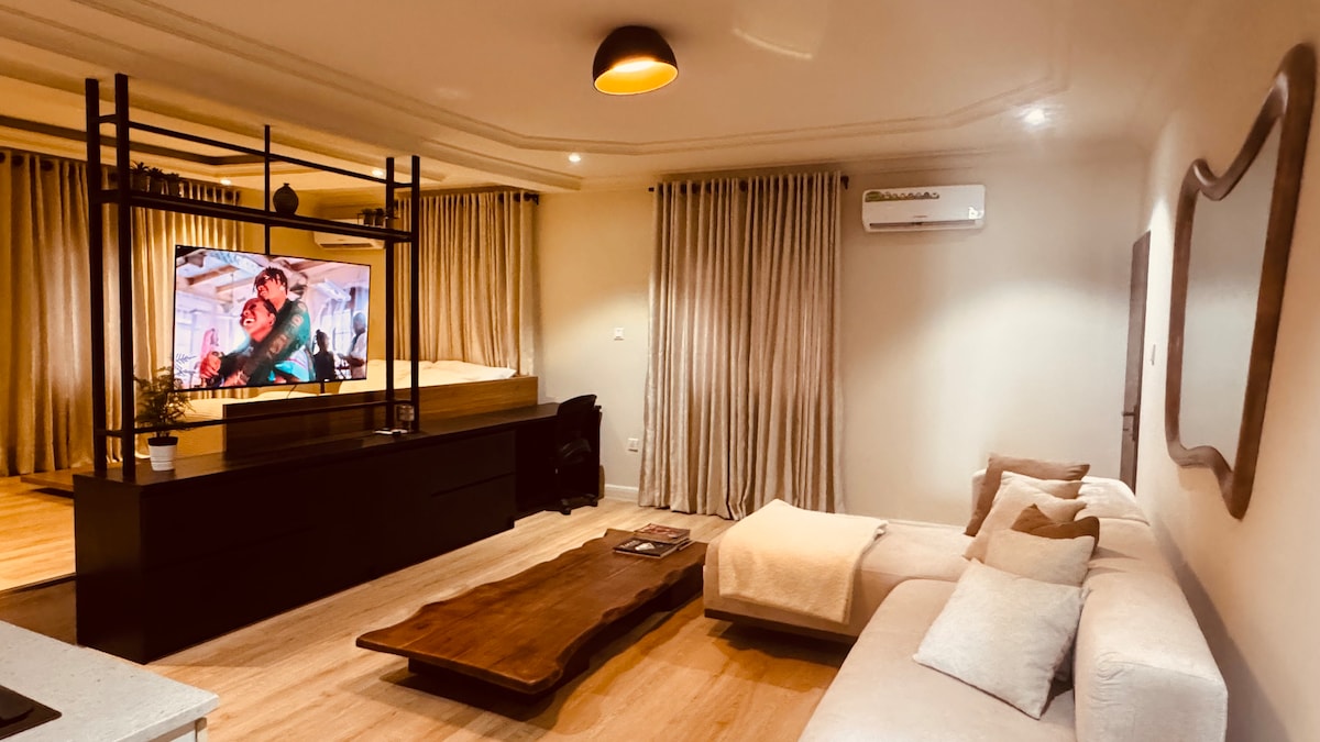 Welcome to Studio Haven, a cozy urban retreat in the heart of the city! This stylish studio apartment blends modern comfort with warm, inviting vibes. Enjoy a plush bed, soft linens, and a compact yet fully equipped kitchenette. The living area features a smart TV and free Wi-Fi, perfect for relaxing or working. Steps from vibrant cafes, shops, and transit, this haven offers the perfect base for your city adventure right in the heart of Lekki phase 1