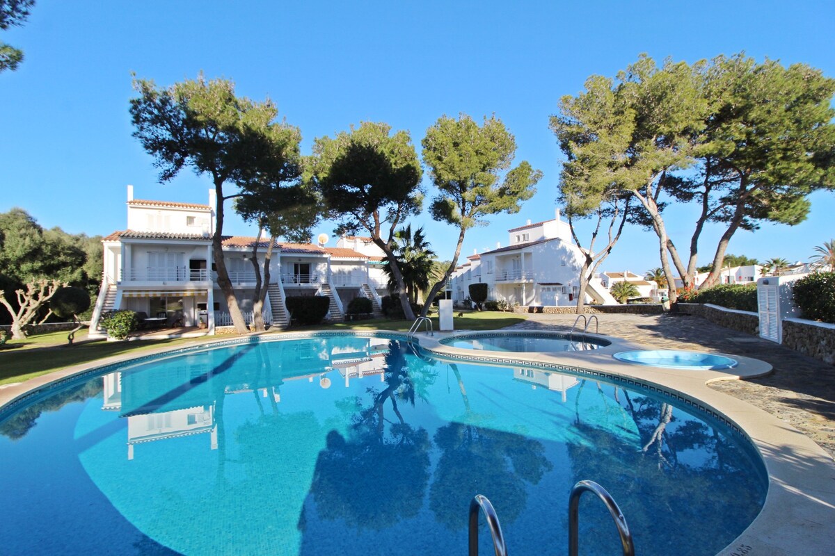 Apartamento ideal para 6 personas con vistas al mar y acceso directo a la playa d'Arenal d'en Castell. 3 habitaciones 2 baños , zona común del salón-comedor y cocina totalmente equipada Disfrutarás de una acogedora estancia, en un apartamento reformado, con toda clase de comodidades a tu alcance. La zona del jacuzzi y sus terrazas ofrecen la posibilidad de disfrutar al máximo de los exteriores de la casa.