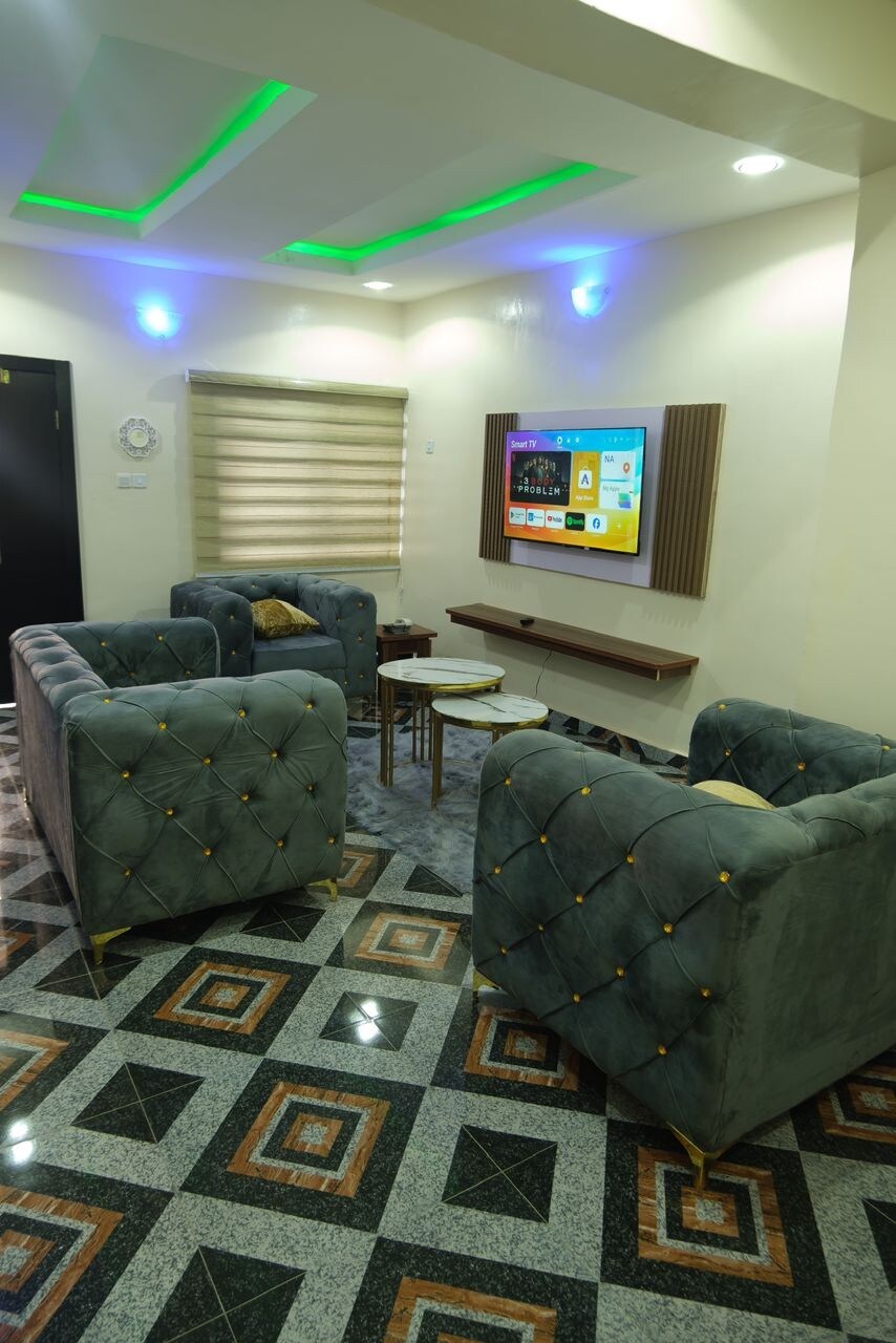Relax with the family and friends at this home away from home. - 24/7 power supply - Access to clean water - Cable TV subscription - 24/7 CCTV surveillance - Cooking gas - Close to shopping mall (shoprite) - Secure & serene environment - Room cleaning Service - Friendly hosts