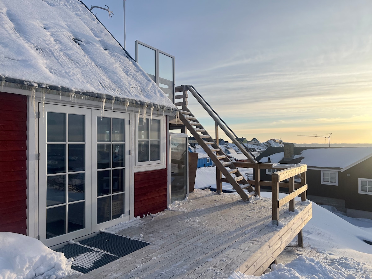 Feel at home in this cozy house just behind the Iconic Zion's Church and just across the road from Knud Rasmussen's museeum. If you are lucky, you will hear the whales sing while you enjoy a cup of coffee on the terrace and if you have the courage and knowledge in kayaking you are free to grab the kayaks at the house - completely on your own risk - and get even closer to them and the great icebergs.