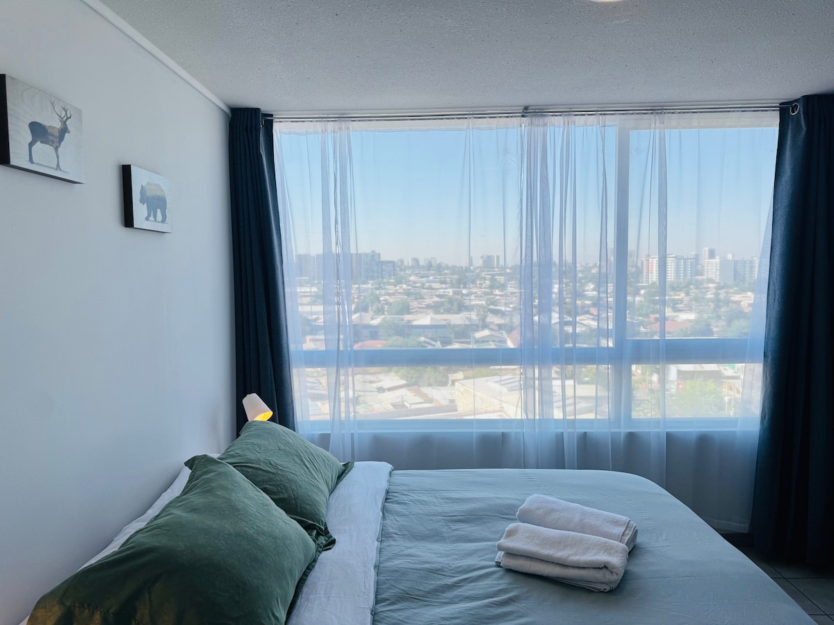 Modern apartment with a beautiful view of the mountain range 🤍 Located in a central and quiet area, one block from the Conchalí metro, 15 minutes from the airport, 10 minutes from downtown Santiago and less than a 5-minute walk from the Chile Racecourse and Santa Laura Stadium. 1 bedroom + sofa bed in the living room An equipped Kitchen Private bathroom Balcony overlooking the mountain range WiFi and TV with apps Fully equipped Modern, comfortable and minimalist Pool, gym, quincho, co-work and event room