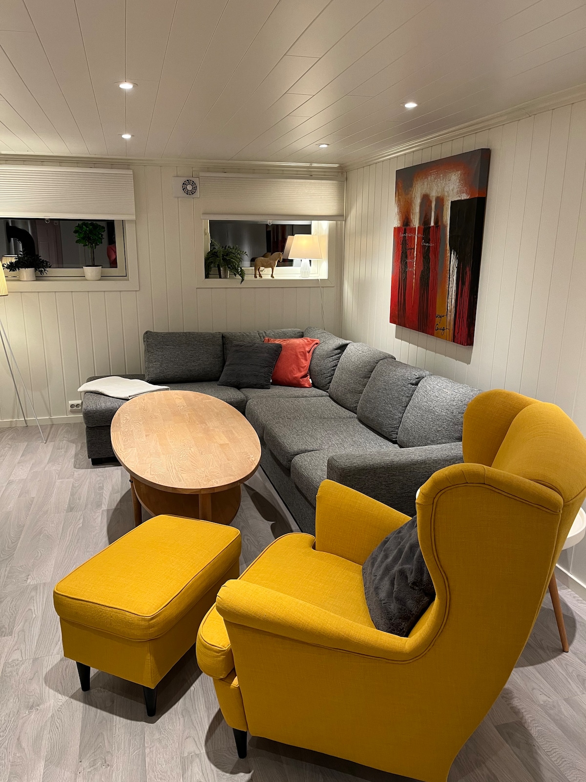 Newly renovated apartment in a great location. Here you are close to the field with hiking trail a stone's throw away. Although the apartment is right on the edge of nature, you live very centrally. A sauna and hot tub are available for an extra fee. They are located on the side of the house with a nice view of the natural surroundings. Price: NOK 600 for either the sauna or the hot tub, and NOK 1,000 if you wish to use both for two hours. This has to be arranged well in advance with the host, who will warm up the place and get everything ready for you.
