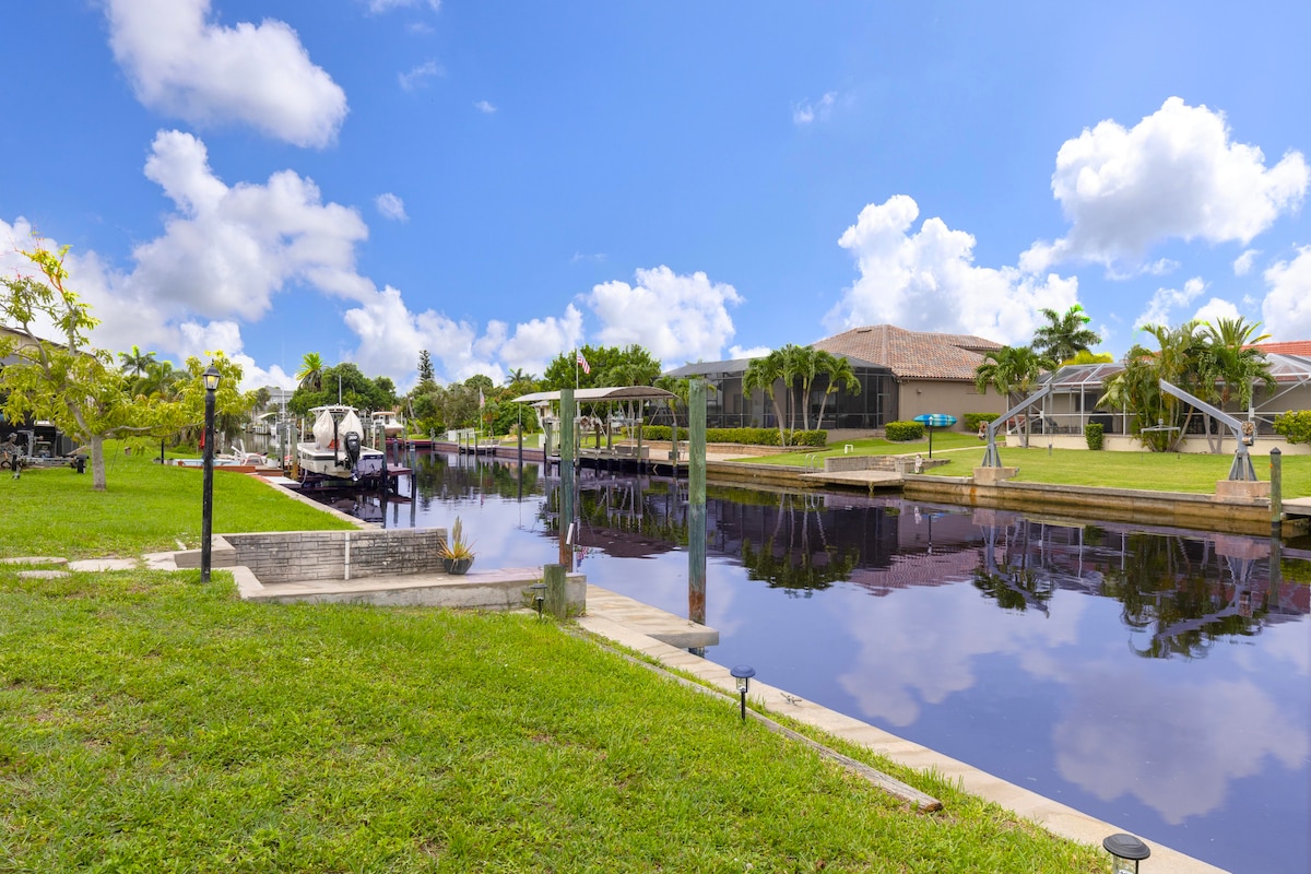 ONE OF THE BEST WATERFRONTS IN CAPE CORAL! A short walk to the beach a. This 2,500+sq ft home has stunning sunsets and South Western water views from all main living areas,as well as the Master Suite. Heated pool w/ LED colored lighting, built in Spa,Pool bath, full laundry facility, Lanai,Fireplace ,Wi-fi and TVs in every bedroom, private dock . Boat on lift for rent w/RPM rentals . Large 2-car garage w/5 bicycles,beach wagon & cooler on site.