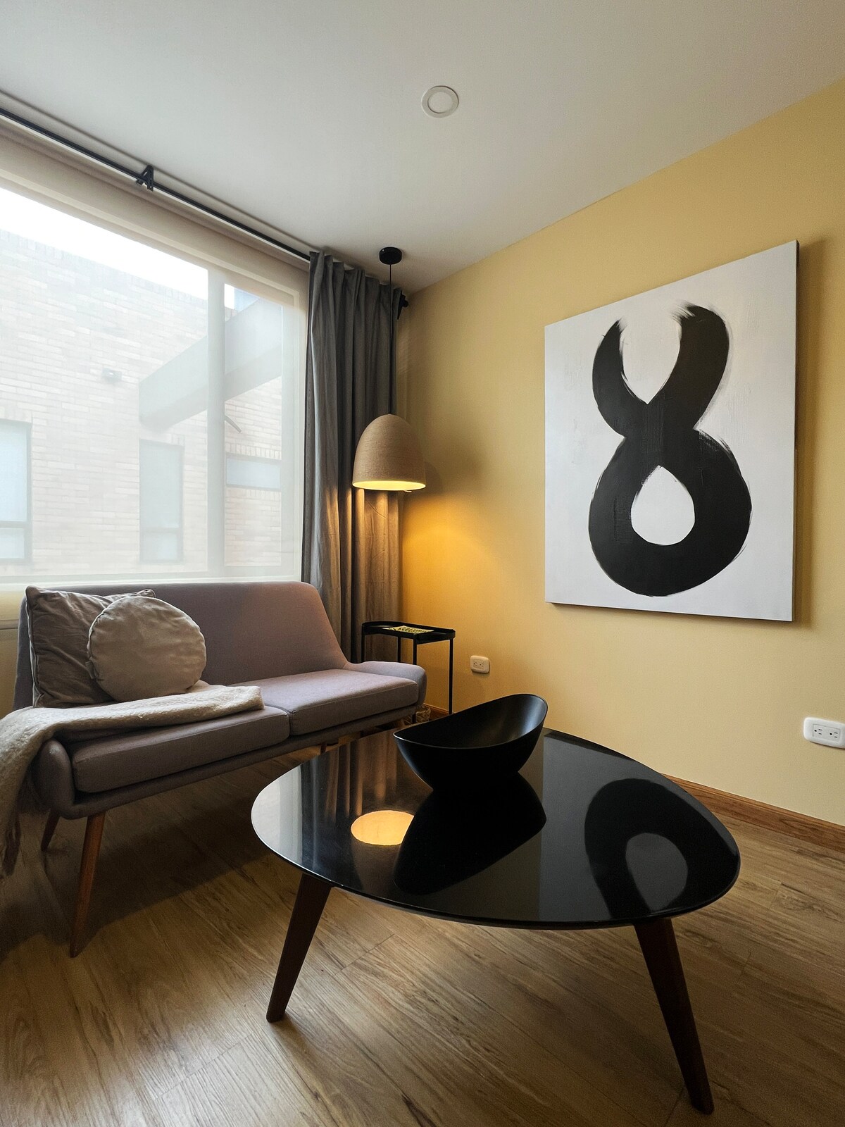 Modern and elegant loft apartment, ideal for two people looking for comfort and location. Located in the Andes 99 project, a short walk from Calle 100 and close to Usaquén, the accommodation combines contemporary design with high-quality finishes. Its large windows fill the space with natural light and offer views of the city. It has a separate bedroom, private bathroom and integrated social area that invites you to relax after a day of work or sightseeing.