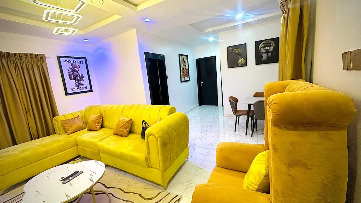 Welcome to Elmstead Luxury Aprt , your stylish retreat in Lekki Ikota. This 2BR/2BA haven offers A/C comfort, a 65″ TV in the living room, 43″ TV in bedrooms, free stable unlimited Wi-Fi, and 24/7 power with inverter & solar. Enjoy smartlock self check-in, free parking, an in-unit washer, and a kids’ bouncing castle. 1 Free cleaning for stays over 5-6 nights. Close to Lekki conservation Center, Mega Chicken, Blackbell & Blemco. perfect for solo travelers, business guests, families, or long stay