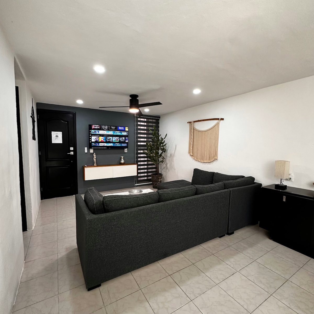 Fully equipped luxury apartment overlooking beautiful artificial lagoon, the largest in Cancun to enjoy your holidays, the Laguna has 1.8 hectares and 7 Albercas, has Kayak to practice, jogging track around the lagoon, all in Dream Lagoons. It has wifi, Smart TV, kitchen, air conditioning, security filter and 2 parking lots. 20 minutes from the airport and the hotel area, 25 minutes from Playa Tortugas. WE INVOICE. No smoking.
