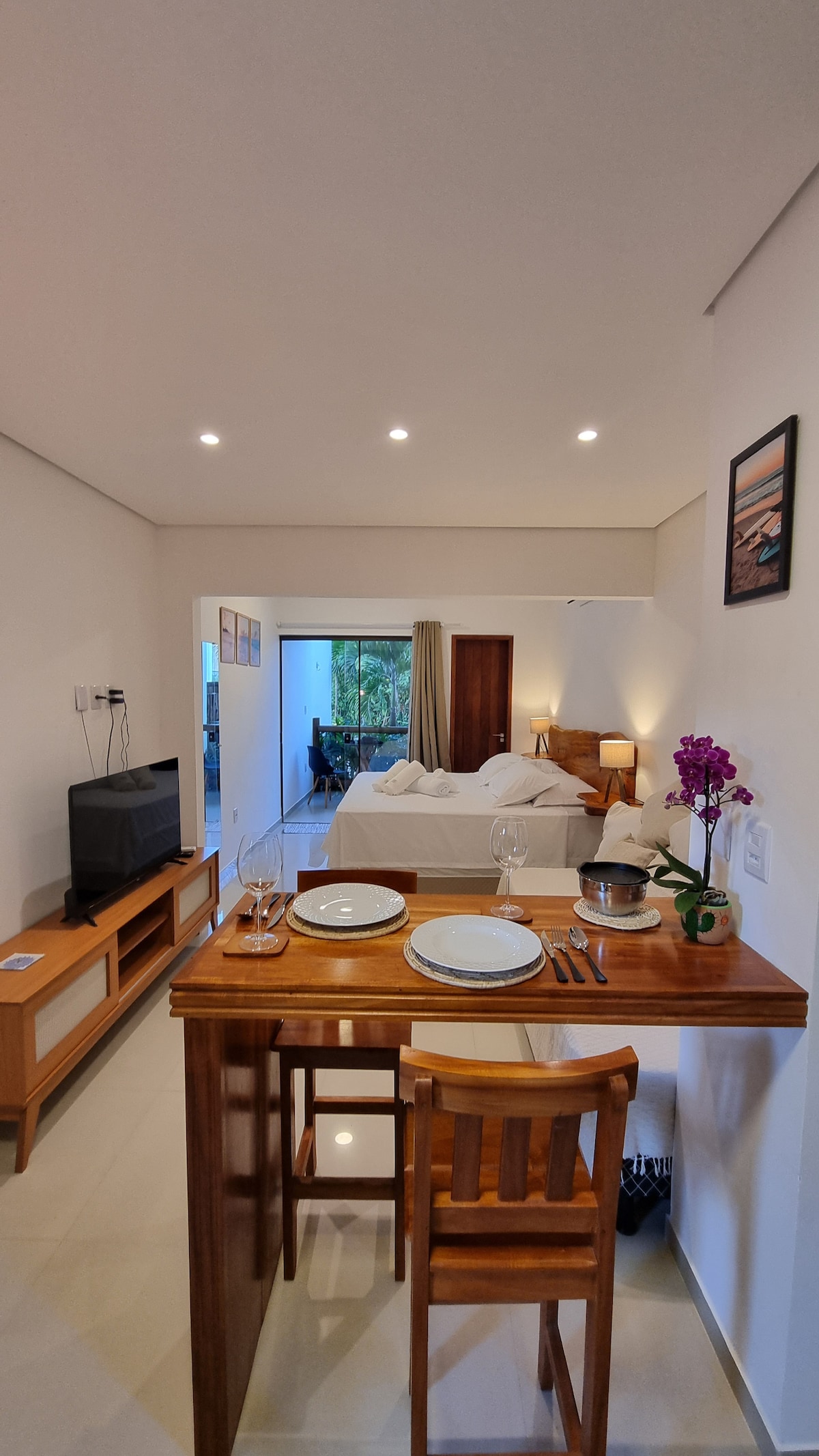 Private 420 ft² apartment in Vila Real with a private balcony and Mexico-inspired décor. Quiet location surrounded by nature, just 900 meters from the city center. Includes Wi-Fi, Netflix, air conditioning, garage, and shared access to a terrace with swimming pool and sea view. Full kitchen, stylish living room with HD TV, luxurious double bed, comfortable double sofa bed, and spacious bathroom with excellent shower. Parking available on the property. Follow: @vilareal_itacare