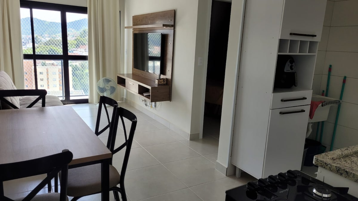 A large suite, one room with a sofa bed and a study table. A bathroom with shower. Modern room in a clean setting, dining table with 4 chairs and a full kitchen. It has a large balcony area with a barbecue area. Apt with a parking space. Building with security cameras. Near Unifei and the city lake.