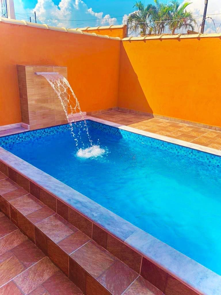 Private space for guests, pool with waterfall, bathroom with hot shower, cold shower near the pool, refrigerator, stove, electric oven, barbecue and barbecue kit. We serve portions: shrimp, calabresa, chicken, fries, (not included in the daily rate) Private street, no exit, paved, 10 min. walk to the beach. obs: owner lives in the front house, edicule is reserved and private to guests. .