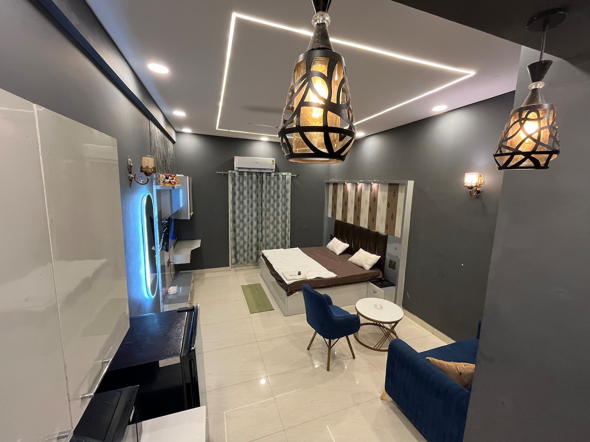 Welcome to this beautifully designed studio apartment located in the heart of Greater Noida West. Perfect for solo travelers, couples, or business guests, this studio offers a comfortable stay with all modern amenities. What You’ll Love: Spacious, well-lit room with a luxurious queen-sized bed. Elegant ceiling design with ambient lighting and stylish fans. Smart TV with entertainment setup and cozy seating. Air-conditioned comfort. Private balcony. Refrigerator. Clean, modern bathroom.