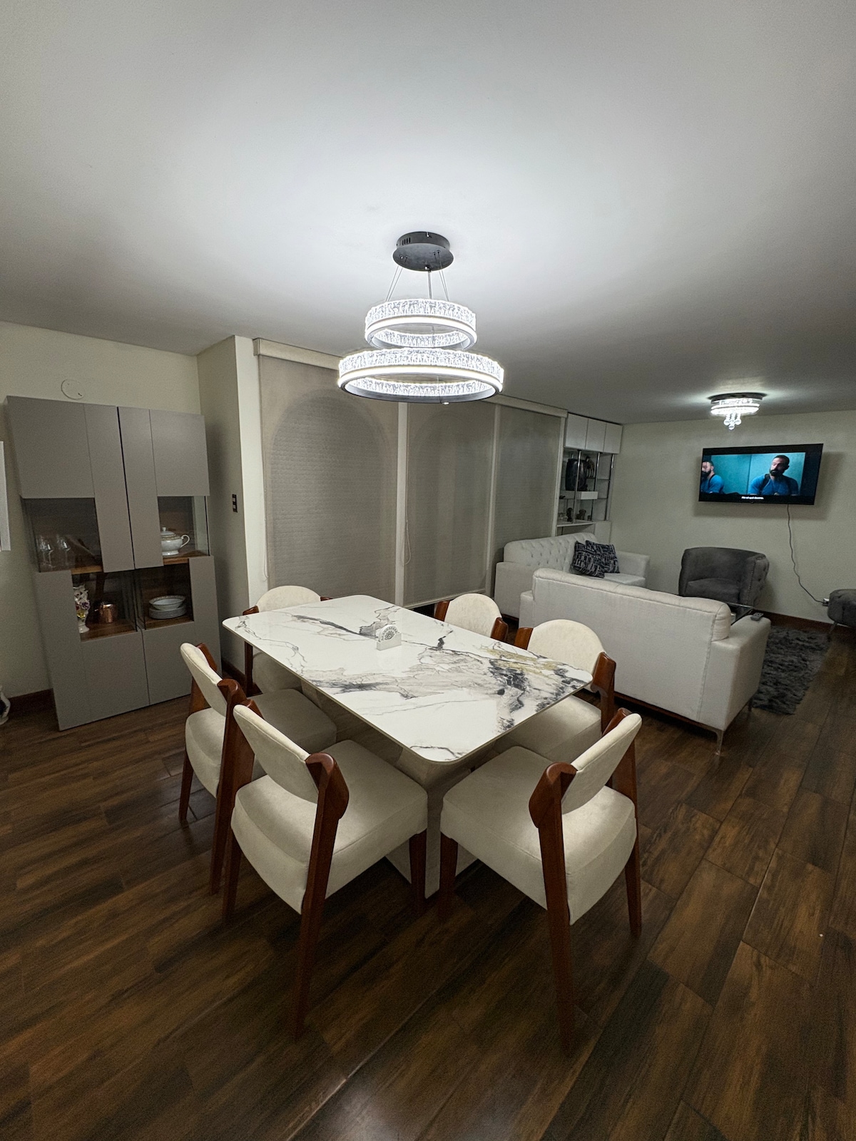 It consists of a living room with a 65" TV with NETFLIX for your total entertainment, plus a sound system for your comfort. A dining room, a kitchen equipped with appliances and complete kitchenware for your stay. It has three bedrooms, each with a double bed, Smart TVs in each and tables with chairs, with a built-in wardrobe. One of them has a private bathroom and the other two have a shared bathroom. It has a garage. It has hot water all day and a good WIFI signal. It has premium finishes.