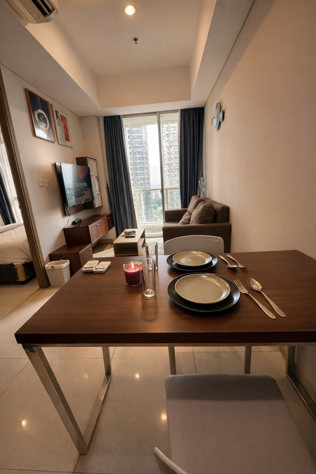 An elegant 24sqm studio in Jakarta's center, blending style and convenience. Includes kitchen, fast Wi-Fi, air-purification, 43" smart TV, sound system and Netflix. It is ideal for various stay types, with contactless access and amenities like pools, jacuzzi, gym, and basketball, Now features a Reverse Osmosis dispenser & food waste disposal, The picture shows a gas stove that has been replaced by an induction cooker (to follow the apartment guidelines for fire hazards)