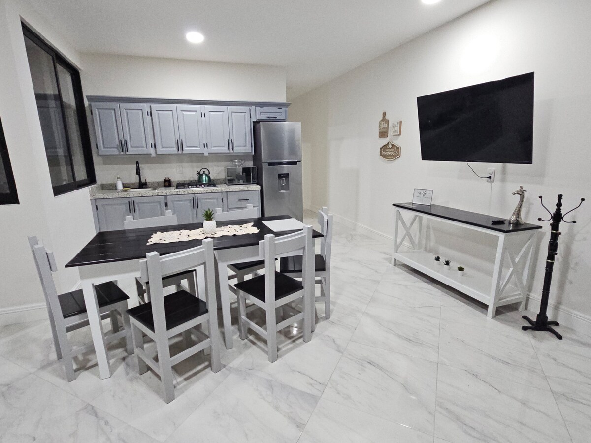 The house is a cozy and comfortable space, in it you can find a full kitchen with some accessories if you want to cook a snack. It also has two bedrooms, each with a double bed, a large closet, blankets, towels, and enough electrical connections to make your stay pleasant. It has a dining room for four people, a medium refrigerator in excellent condition, a bathroom with a shower, a storage patio with a laundry room and a garage for one vehicle.