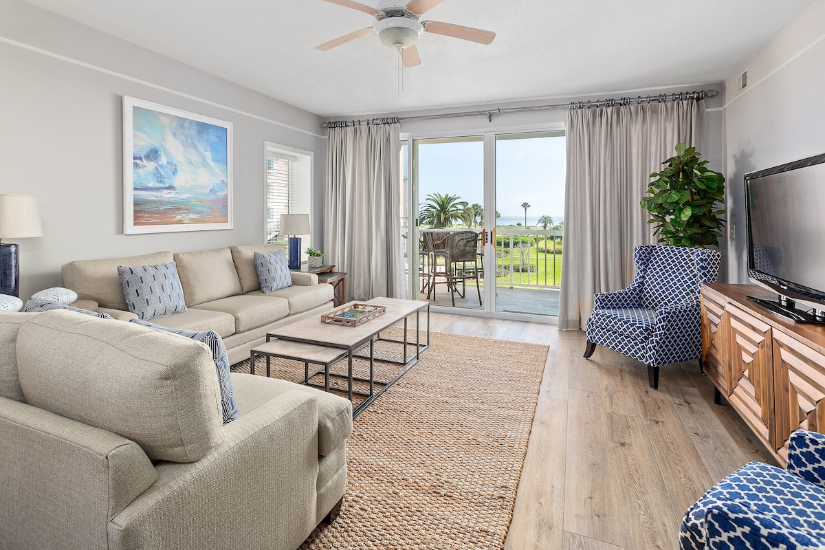 Comfort, relaxation, and beauty await you here - On the quieter and most private side of the Beach Club - with direct, gated beach access . Enjoy our oceanside saltwater pool, 2 hot tubs, and lush gardens - in the perfect spot, on one of the prettiest beaches in the South! Primary suite with king bed, walk-in shower/soaking tub. Second bedroom with 1 queen/ 1 twin, full bathroom. Well-equipped kitchen, full balcony... Come on, the dolphins are waiting for you!