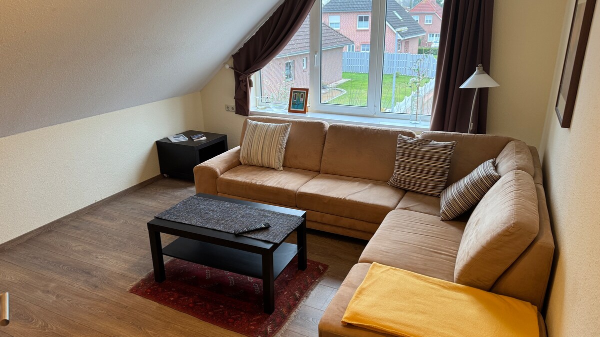 A very quiet apartment, on the ground floor and with its own entrance, offers complete accommodation in a cozy and nordic style. Nicely furnished with a living area and two high-quality single beds, it creates a comfortable stay for all ages. The south-facing terrace and parking are right in front of your own door, and all sights are easily accessible. Whether visiting the islands, walking on the dyke, cycling and city tours, a visit to NL - you live here in the center of East Frisian serenity.