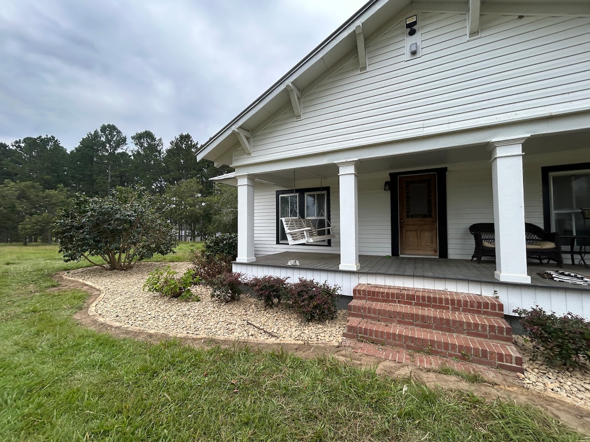Miss Sue’s House is a charming early-1900s white farmhouse that blends historic character with modern comforts. Located on a quiet dirt road on the north end of Bulloch County, 20.8 miles from Georgia Southern University. The home features three bedrooms, a study, and one bathroom, along with central heat and air, Wi-Fi, and a smart TV. Guests can relax in the hot tub, enjoy the game room with a Pac-Man arcade and pool table, or unwind on the cozy front porch with a swing and rocking chairs.