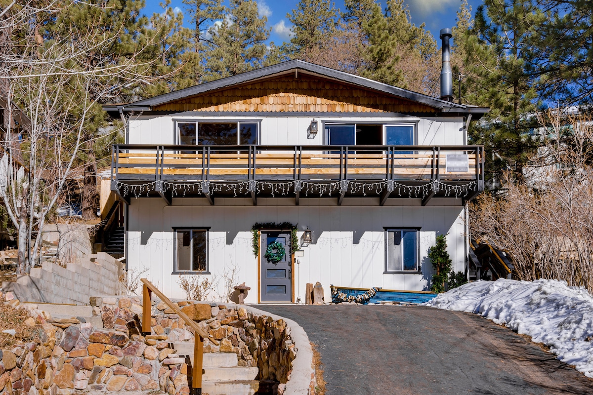 A cozy, mid-century A-frame nestled in a peaceful neighborhood on the north side of Big Bear Lake, but just minutes away from restaurants, shopping, skiing and more. • Panoramic views of both Bear Mountain and Snow Summit from the expansive deck • Quiet, family-friendly neighborhood • Just 3 houses in from the National Forest and miles of hiking trails • Perfect space for a romantic getaway or relaxing with family and friends • Mid-century modern decor • Efficient wood-burning stove