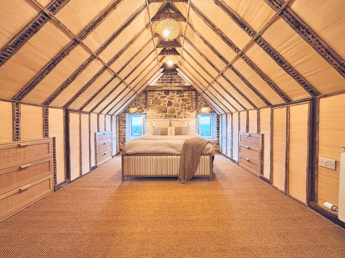 Our spacious studio apartment is just a two minute walk to the beach and a short stroll along the sea front to the popular harbour village of St Aubin. The split-level studio is on the first floor in a separate part of our family home. The bedroom is located on the upper level with sea views towards St Aubin’s Bay. The open-plan kitchen and living area is on the lower level with views across a quiet residential lane towards fields where you’ll often see Jersey cows grazing.
