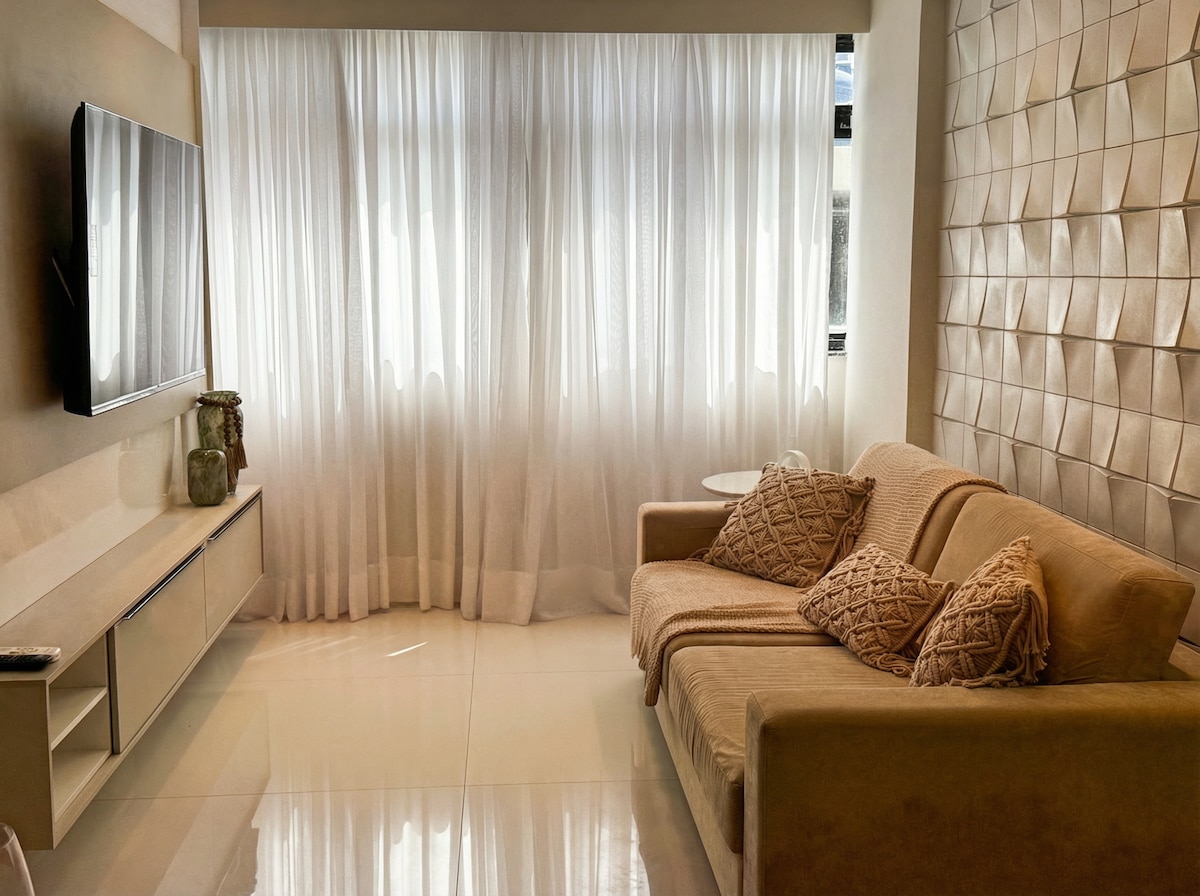 Cozy apartment in the best location of João Pessoa, just minutes from markets, shops, restaurants, Catholic church and close to the city's main attractions. It is located 200 meters from the sea, 100 meters from the Tambaú Market and 300 meters from the Paraíba Craft Market. Fully equipped, with air-conditioning in both bedrooms and the living room, TV, high-speed Wi-Fi Internet, stove, refrigerator, microwave oven and kitchen utensils.