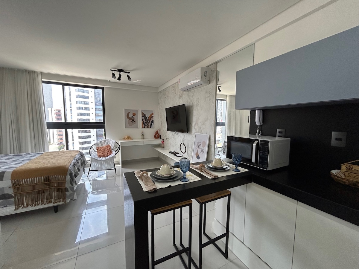 Have the experience of staying in this amazing studio, in a newly opened building with complete infrastructure. Extremely well located on Av. Nego, in the neighborhood of Tambaú. Practical, sophisticated and cozy apartment, in addition to being fully equipped. Enjoy the pool with a wonderful 360-degree view of the city from the rooftop. Are you coming to work? We have coworking! Are you coming with the kids? We have a kids' space! Do you like to work out? We have a fitness center!