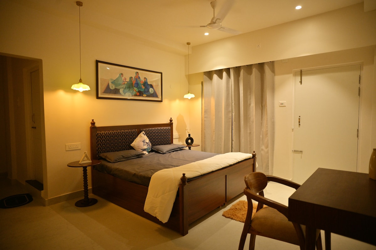 Welcome to your home away from home! This comfortable 1-bedroom air-conditioned room offers a serene and cozy retreat for solo travelers, couples, or business visitors. Featuring a plush bed, a comfortable sofa for lounging, and thoughtful amenities, it's designed to provide a perfect balance of relaxation and convenience.