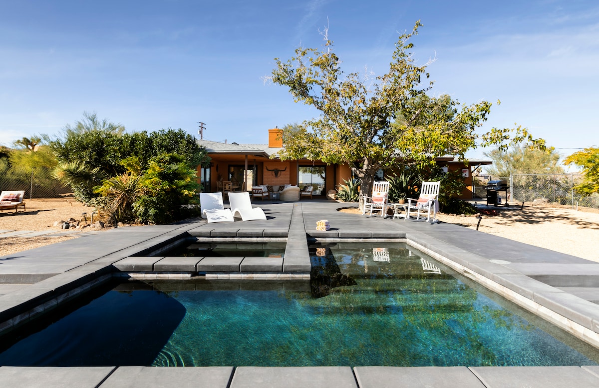As seen in Bloomberg & TIME magazine! Welcome to The Backyard at Joshua Tree! This modern luxury home is a 3 bed, 3 bath villa featuring a brand-new pool, Pickleball court, hanging daybed, fire pit, 6-seater spa, cowboy tub, ping pong table, Bocci ball pit & Tesla charger! Enjoy dinner with a beautiful view of the Joshua Tree Sunset. This thoughtfully designed modern home is close to 29 Palms Road, only a 10-minute drive to the National Park entrance & only 3min away from main street JT!