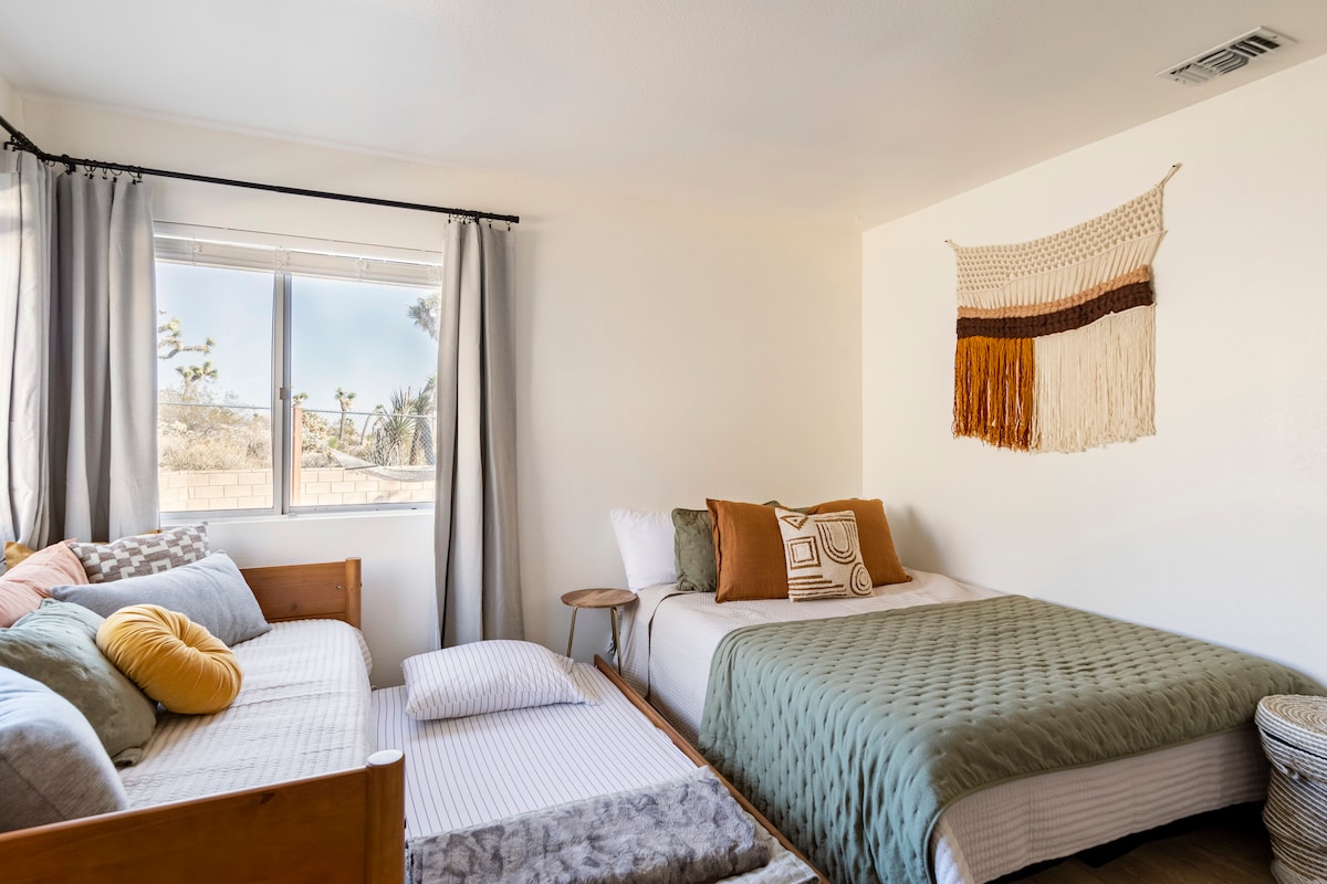 Just 8 minutes to the park entrance! The Resting Rabbit is located in the heart of Joshua Tree Village. Enjoy Roku smart TV, high speed WIFI, game room, fire pit, BBQ, & more. *Please note* The projector is currently unavailable due to a screen issue, but the TV is fully functional with all the same streaming options. 5 minute walk to the local & popular: Joshua Tree Coffee, Crossroads Cafe, Natural Sisters Cafe, Country Kitchen, local shops, Farmer's Market & Visitor's Center