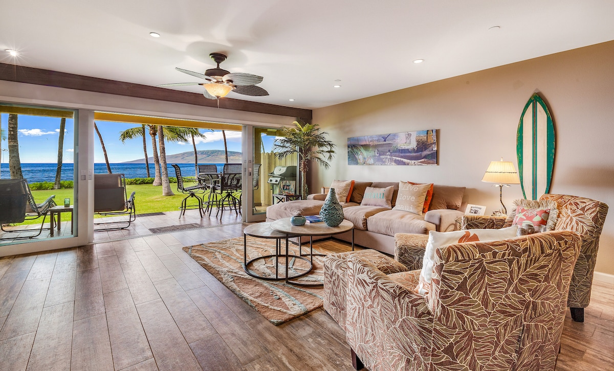 Locally Owned and Operated 1BD/2BA condo with the best direct beachfront location, panoramic Ocean views, sunsets, and seasonal whale watching. The owner’s spared no expense in renovating this unit making it hand’s down one of the nicest units in all of the Mahana. Wake up to the cool tropical breeze and sounds of the shoreline just 50 feet away. Floor to ceiling windows in the living area and bedroom bring the stunning views and warm Maui sun inside while central AC keeps you cool inside.