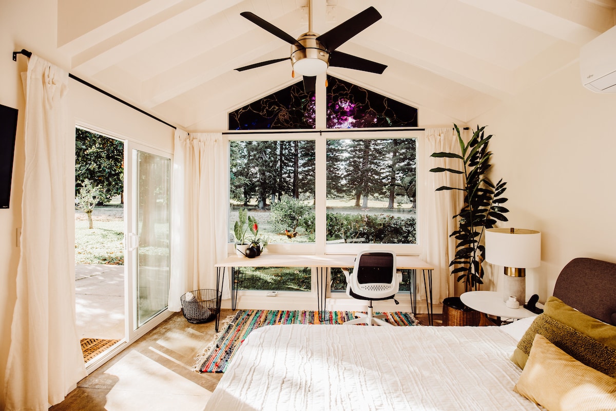 Air Conditioning is in the living room and principal bedroom. Guest bedroom has a ceiling fan only. Welcome to the The Hale Mahalo, The House of Gratitude. A private freestanding cottage with its own Private Heated Plunge Pool. Air Conditioning, a rare amenity on Kaua'i, cools the space for a restorative nights sleep. Relax after a day of exploring paradise with views of a lush emerald canopy of trees. The songs of the Tropical birds abound at dawn and dusk.