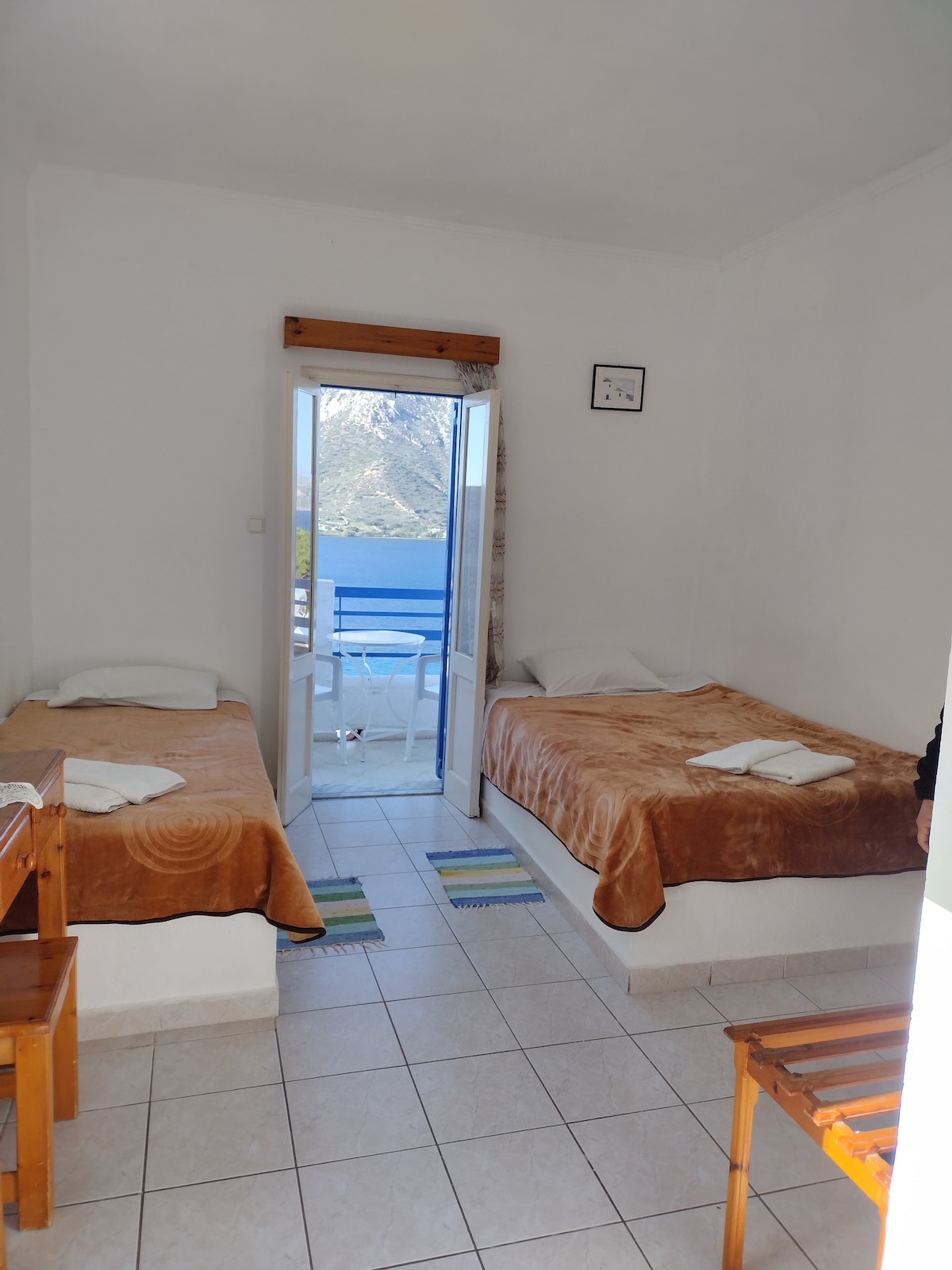 A balcony offers a wooden table set with two black chairs, overlooking a scenic view of the coastline and mountains. The surrounding area features white buildings, with the blue sea stretching into the distance under a partly cloudy sky.