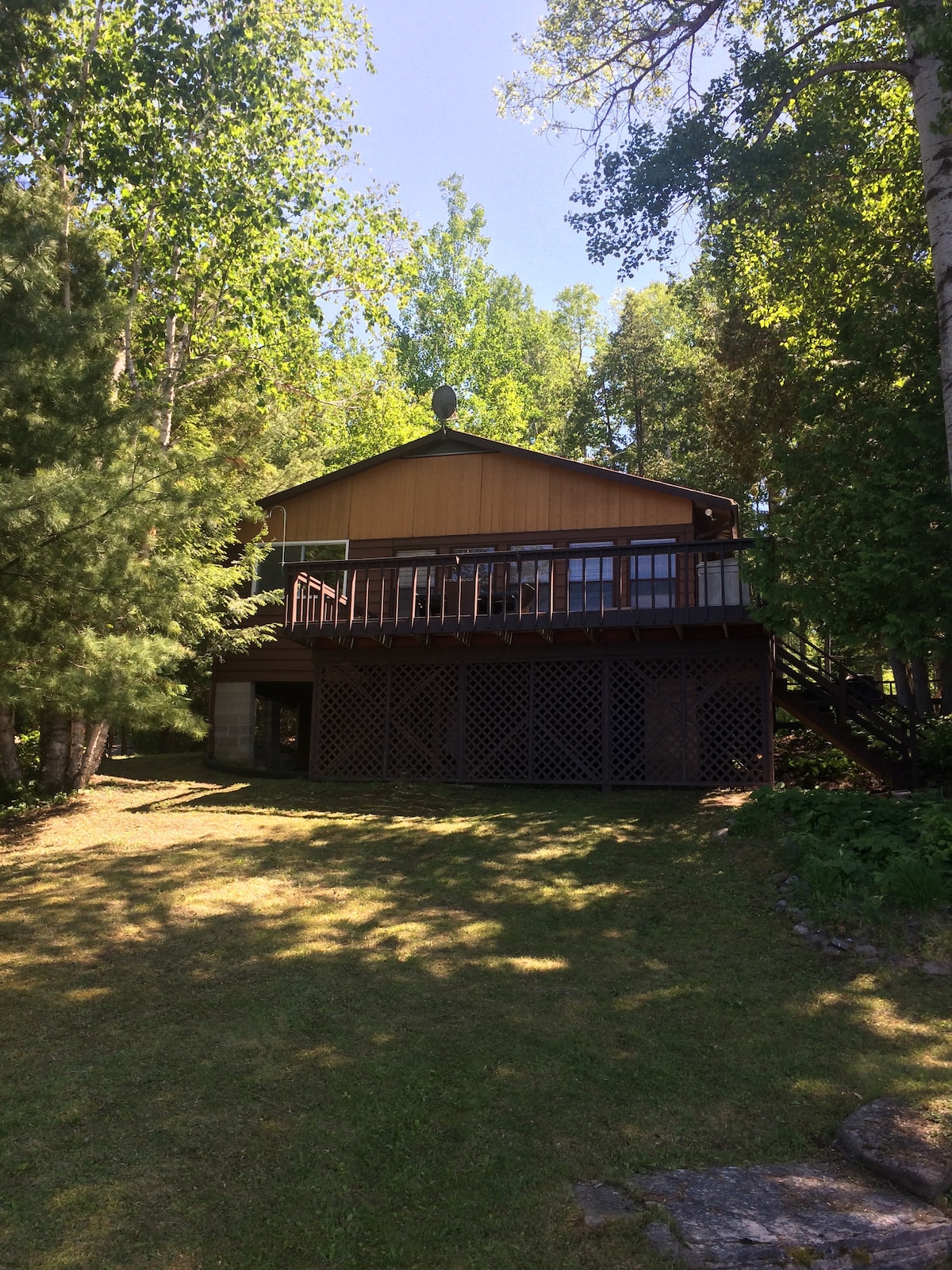 Our little cottage sits nestled in pines overlooking beautiful Kamaniskeg Lake. We are near Algonquin Park. The recent renovations include a tastefully decorated space with the feel of a cozy Canadian cabin.. The beds are excellent. You can enjoy the view and ambience sitting in the screened in porch overlooking a spectacular view or sit lakeside on the patio. The cottage has a fully equipped kitchen and bed and bath linens . Satellite tv as well.