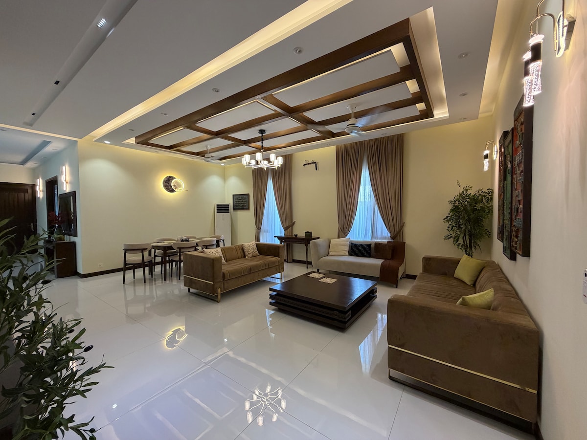 WELCOME to A Luxury Residence, an elegant newly built bungalow set in a tranquil and prestigious neighborhood in DHA Karachi’s prime location — only 30 minutes from Jinnah International Airport, and just 10 minutes from Dolmen Mall Clifton and Sea View Beach. This two-story bungalow offers comfortable and stylish accommodation for up to 8 guests with 4 en-suite bedrooms, each equipped with modern amenities to ensure a luxurious and memorable stay. We only accept bookings from families.