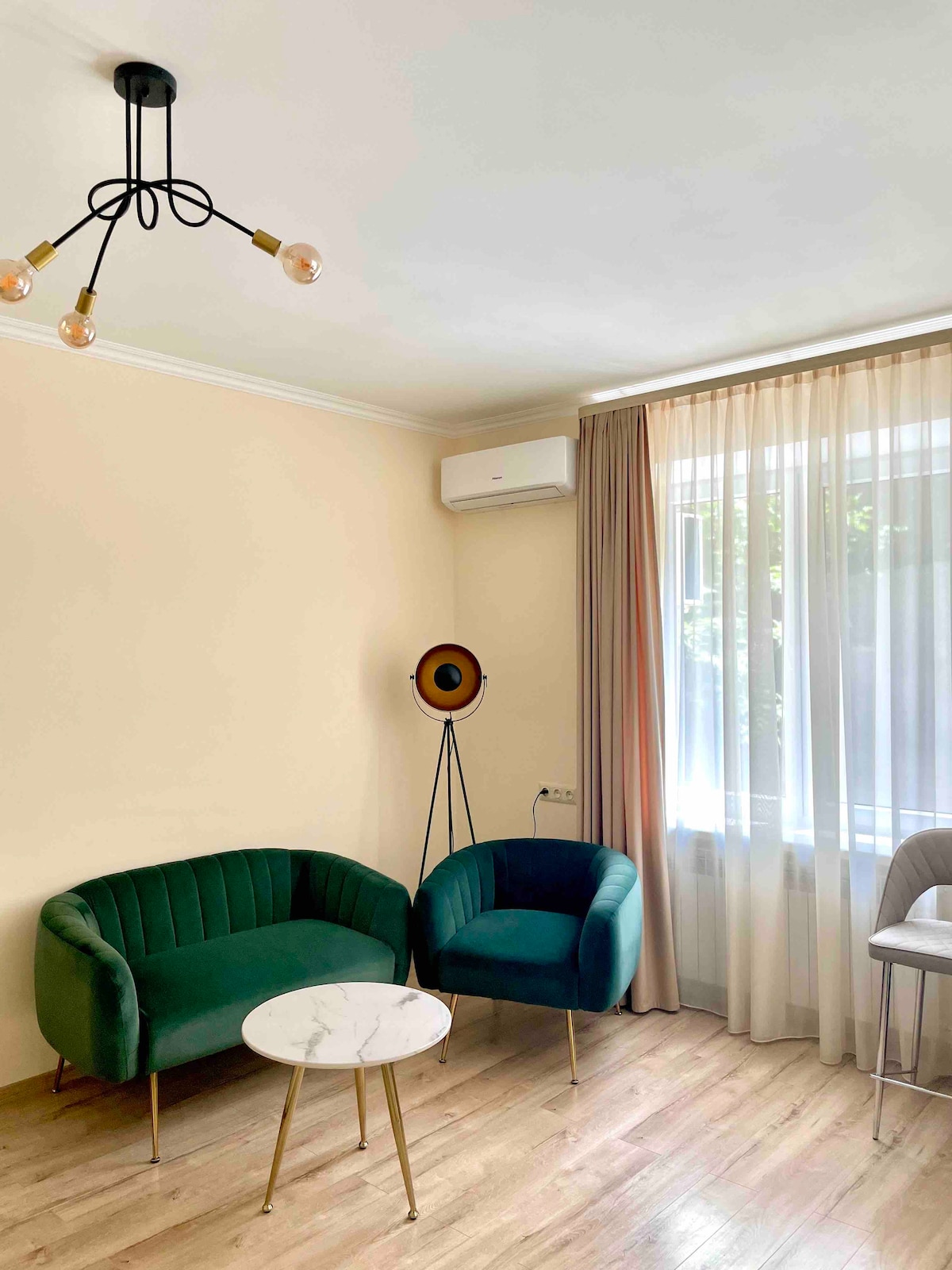 A spacious bright apartment in the heart of Yerevan!Great location and conveniently accessible to everything you need from restaurants,coffee shops,tourist spots.The apartment comes fully equipped with everything you need for your trip.Living room dining area with a sofa bed,kitchen with applinces inc mocrowave and coffee machine, bedroom with double bed and bathroom.Your health is our priority.Our home follows an enhanced cleaning protocol,with a professional cleaning and srtagic disinfection.