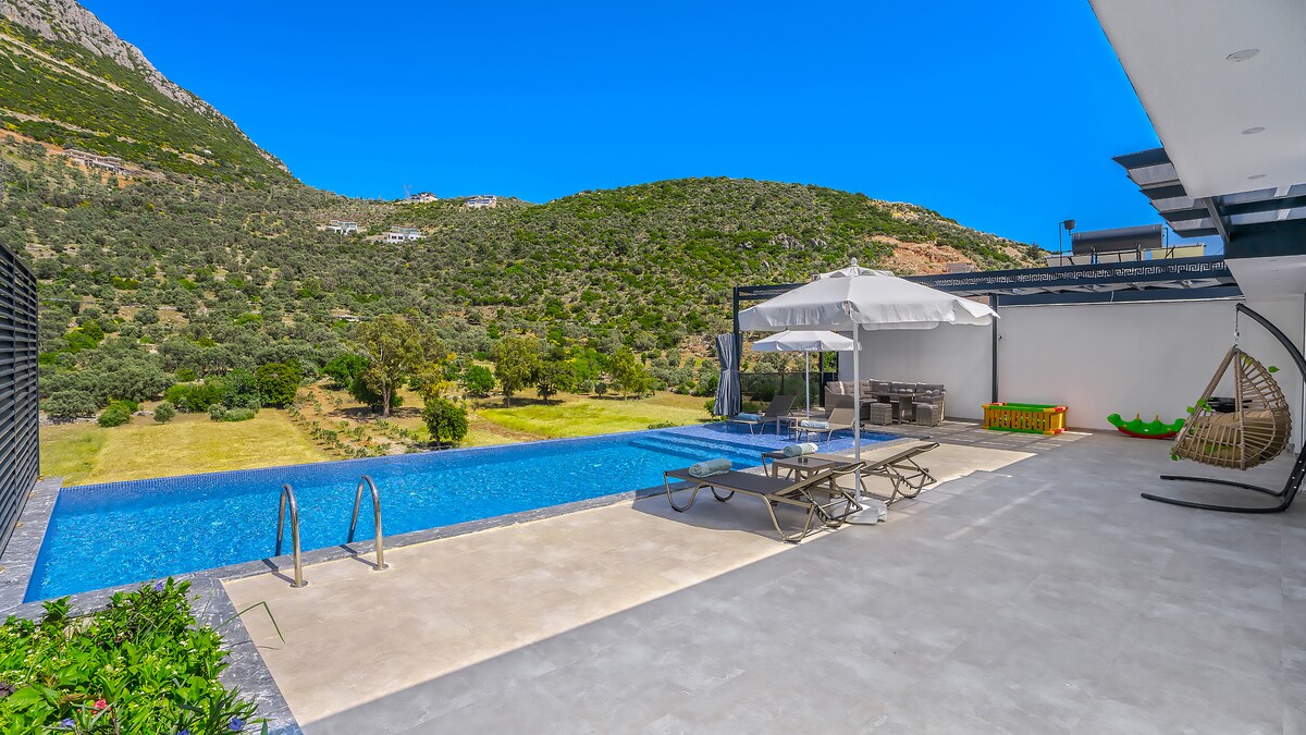 Step into the luxury villa located in a quiet area above the magnificent coastal city of Kalkan. It promises a magnificent rest with a breathtaking view of the natural environment that allows you to immerse yourself in the luxurious environment while enjoying a refreshing drink by the large sauna and large swimming pool. ✔ 2 Comfortable Bedrooms ✔ Open Design Living ✔ Full Kitchen ✔ Garden (Large Pool, Barbecue, Living Room Seating Group) ✔ Smart TV ✔ Sauna ✔ High-Speed Wi-Fi ✔ Free Parking More below!