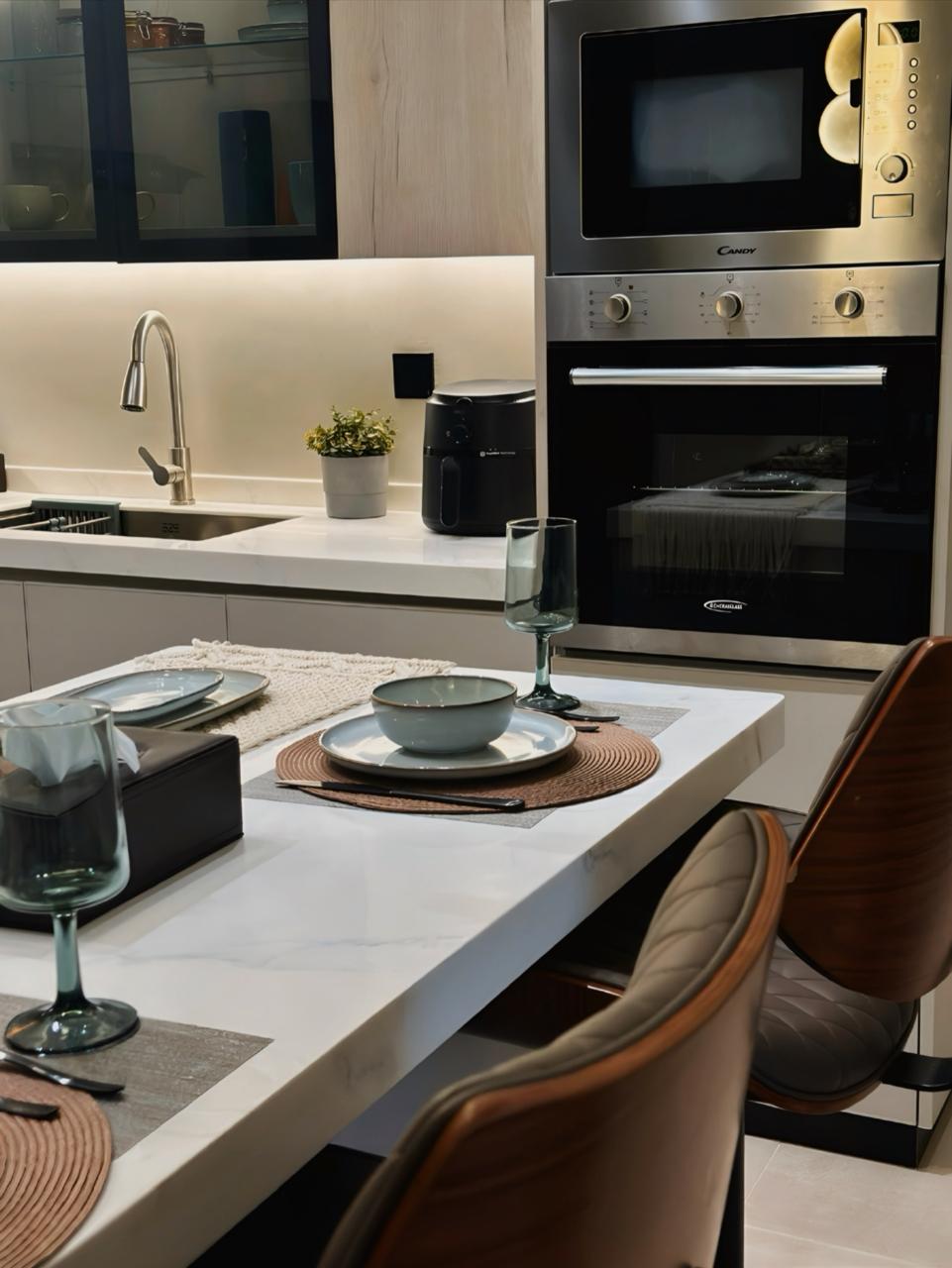 The apartment features a cozy bedroom with a peaceful atmosphere ideal for deep sleep, as well as a private bathrooom for a unique relaxing experience after a long day. There is also a separate bathroom equipped with everything you need. In the heart of the apartment, you will find a spacious living room with a comfortable sofa, perfect for relaxing or watching your favorite movies, along with a stylish bar that adds a wonderful modern touch and makes the space ideal for spending quality time. • Private parking • Free high-speed Internet suitable for work and entertainment • High-end furniture and stylish design • A calming and relaxing environment
