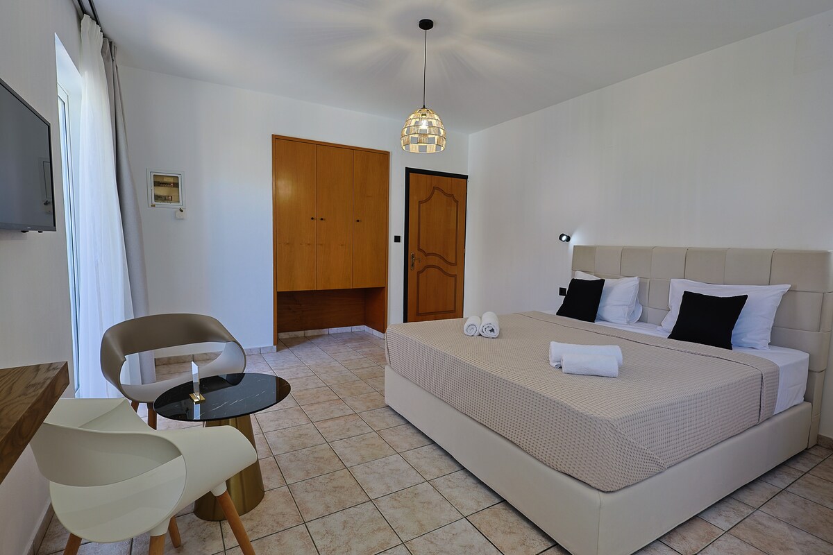 Enjoy an air-conditioned, 34 m2 fully equipped suite with comfy beds, Smart TV, fast Wi-Fi & 2 balconies where you can soak up the Cretan sun. 11m pool with cooling water, plenty of sunbeds and swings are waiting in the green garden for your family & friends during the day, while a covered porch with a dining table creates a wonderful space for an evening BBQ! With TELMARIE you get easy access to all attractions: just a 10-minute walk to shops, taverns and sandy beaches; no car is needed!
