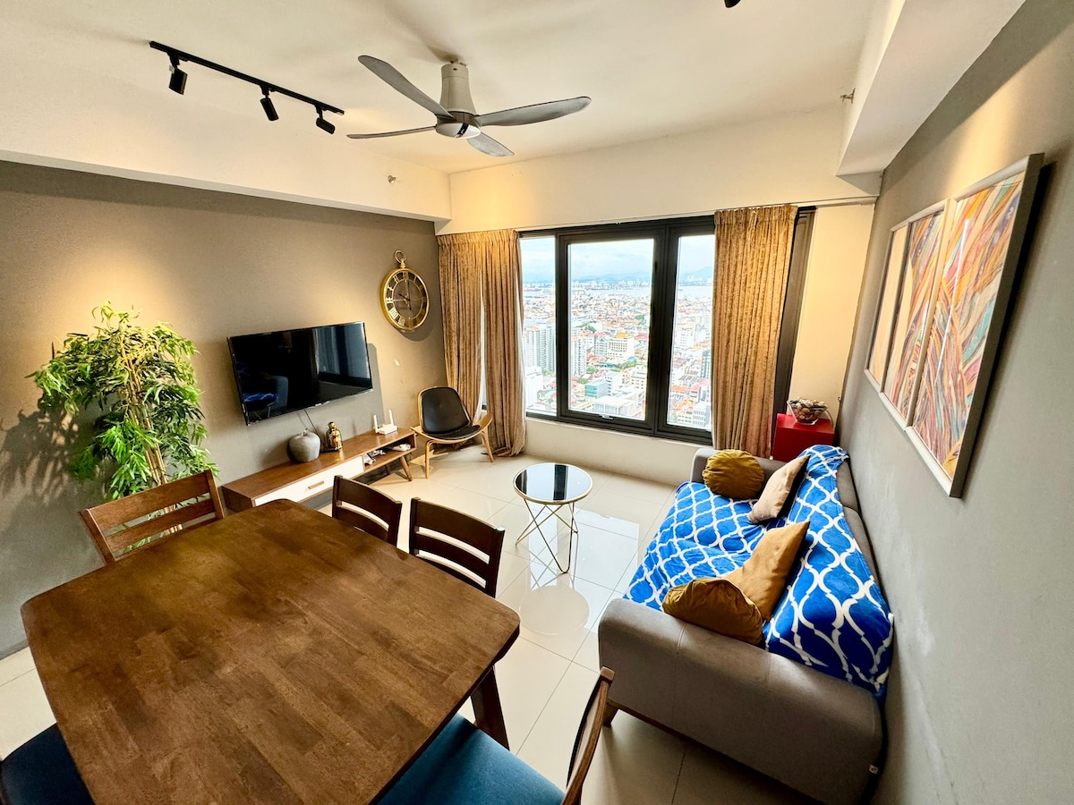 Urban Suites by Comfy Homestay ★ 5 stars SUPERHOST ★ House at level 37 ★ 3 Bedrooms with 2 toilets (City & Partial Sea VIew) ★ 1 private car park at level 10 ★ 100Mbps high speed WiFi ★ Fully air-conditioned ★ 2 min drive to Penang Bridge ★ 2 min drive to Karpal Singh Drive cafe and pubs area (Starbucks, Coffee Bean, McD, Family Mart) ★ 5 min drive to Queensbay Mall ★ 8 to 10 min drive (less than 5km) to Chew Jetty, Street art & UNESCO Heritage old town. ★ 25 min drive to airport