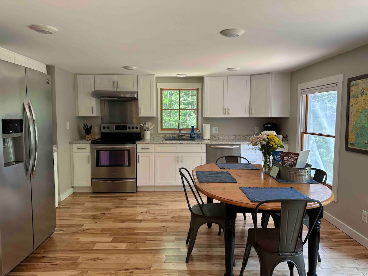 Spacious second story post and beam room adorned with king bed, full kitchen, bath, living area, and laundry. The guest house is located on 40 acres of wilderness with mountain views, and walking trails on the property. Just two miles from Stone Mountain Arts Center, 15 minutes from Fryeburg village, and only 25 minutes to neighboring North Conway, NH. A great retreat for all seasons. TV, High-Speed Internet, AC, Heat, Ceiling Fans, New Construction.