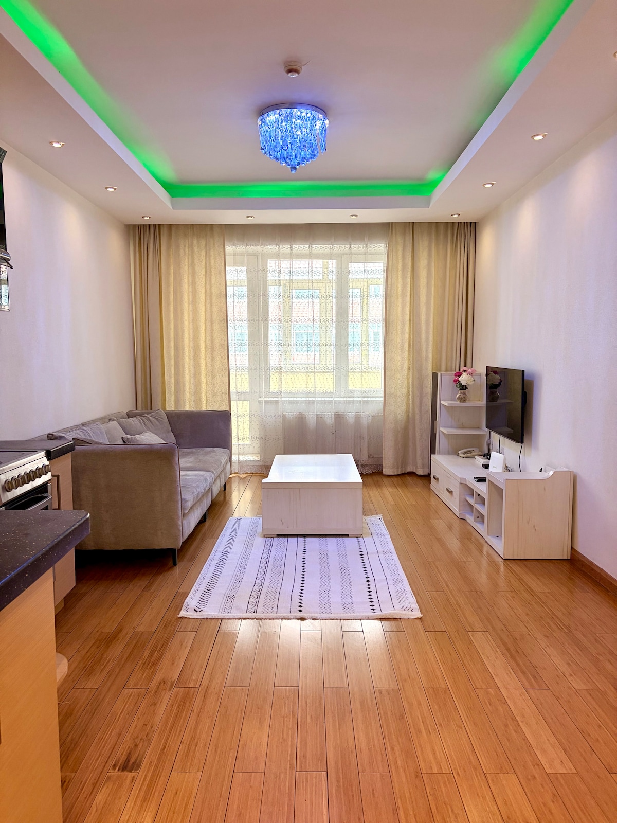 Stylish 65m² 1-bedroom apartment, perfectly located near the city center! Restaurants, shopping centers, banks, and bus stops all within a 10-minute walk. The building offers 24-hour security, parking, and a children's playground. Plus, for longer stays, we provide free weekly cleaning. Apartment Features: - Bedroom:1 (Queen-size bed) - Capacity: Up to 4 guests (with pull-out bed) - Private Terrace with city and mountain view - High-speed WiFi - 24-hour surveillance
