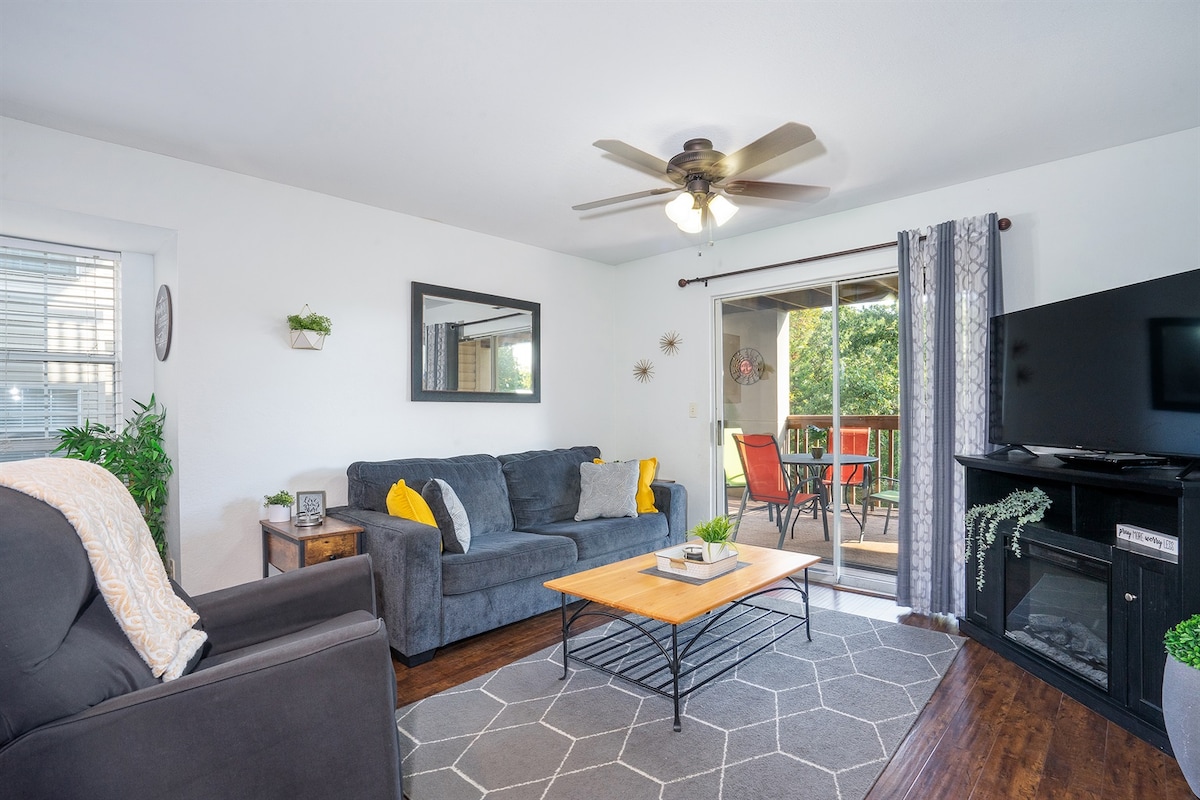 This condo is for you and your special someone! Take time away to relax and spend some much needed time together! Only 6 miles from Silver Dollar City Right in the heart of Beautiful Branson, Missouri, this cozy King Suite is perfect for getting away for a few days. With free Wi-Fi, a Chrome Cast, a jetted tub, and a washer and dryer in the unit, you can spend as little or as much time inside as you wish! With easy check-in/out, free tea/coffee, and no stairs, it doesn't get any better!