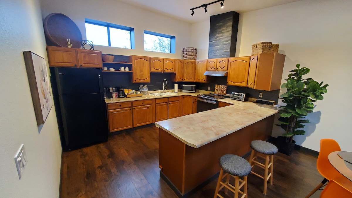 Newly-built upstairs guesthouse with open floor plan, wood flooring, quartz counter tops and island. Full kitchen, large bathroom, and small deck with a great view. One Queen bed, outdoor furniture area, fire pit and BBQ available for use. Come enjoy the country setting, you may even see some wild peacocks or sweet barn kittens! Shopping, lakes, mountains and many beautiful nature escapes close by. Updated Internet to Starlink, works very well *there is a tenant in the downstairs apartment