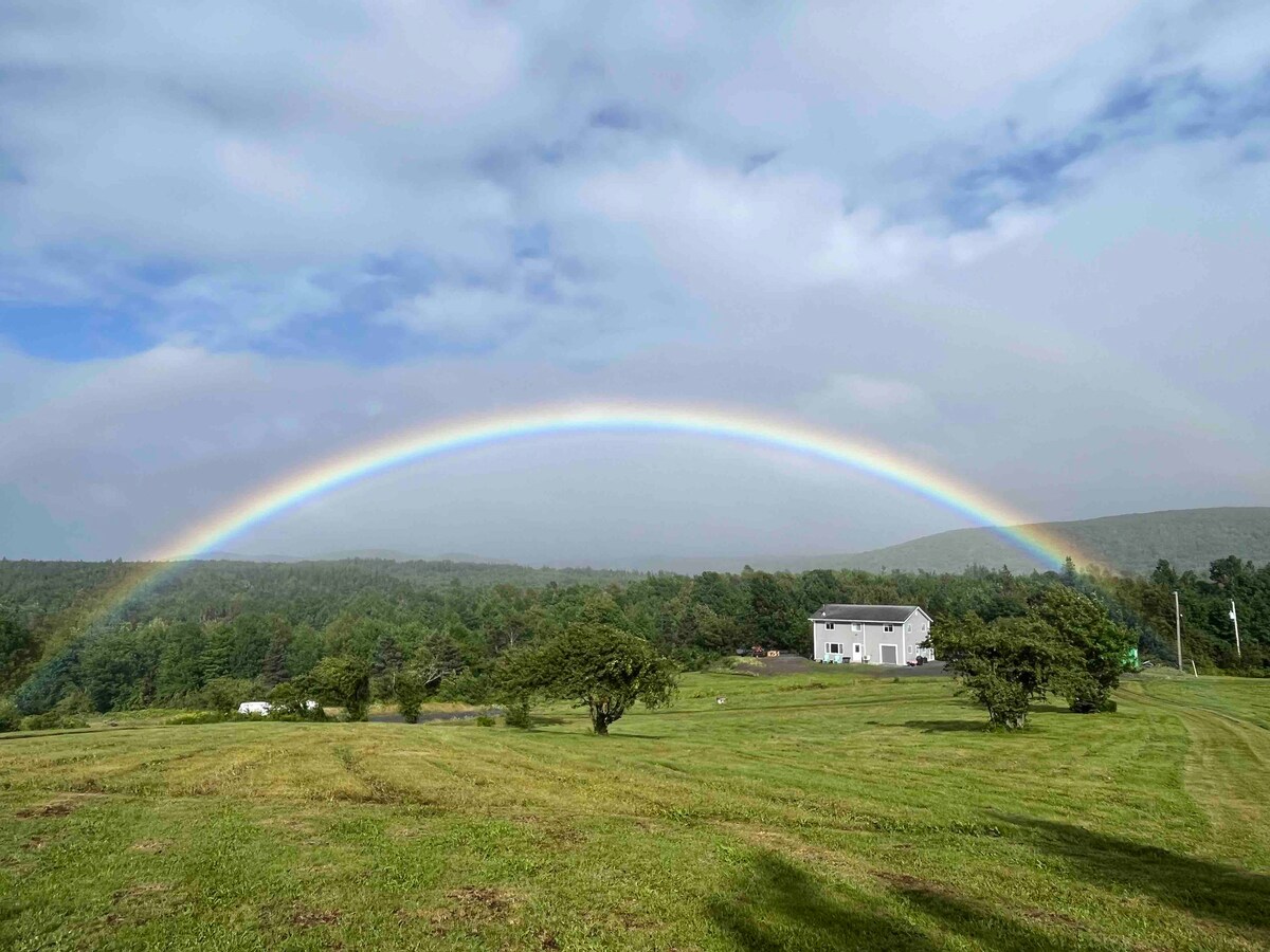 Located on a working farm this charming studio unit is in the upstairs of a newly renovated 1800's farm house. Enjoy the exposed rafters, kitchenette, private bathroom, four-piece bathroom with soaker tub and separate one-piece shower. Turn in for the night on bamboo sheets under a handcrafted wool comforter. This is a working farm with cows in the field, chickens free-ranging (the rooster crows early!) , and Alpine dairy goats. Located just 4 km from StFX University and downtown Antigonish.