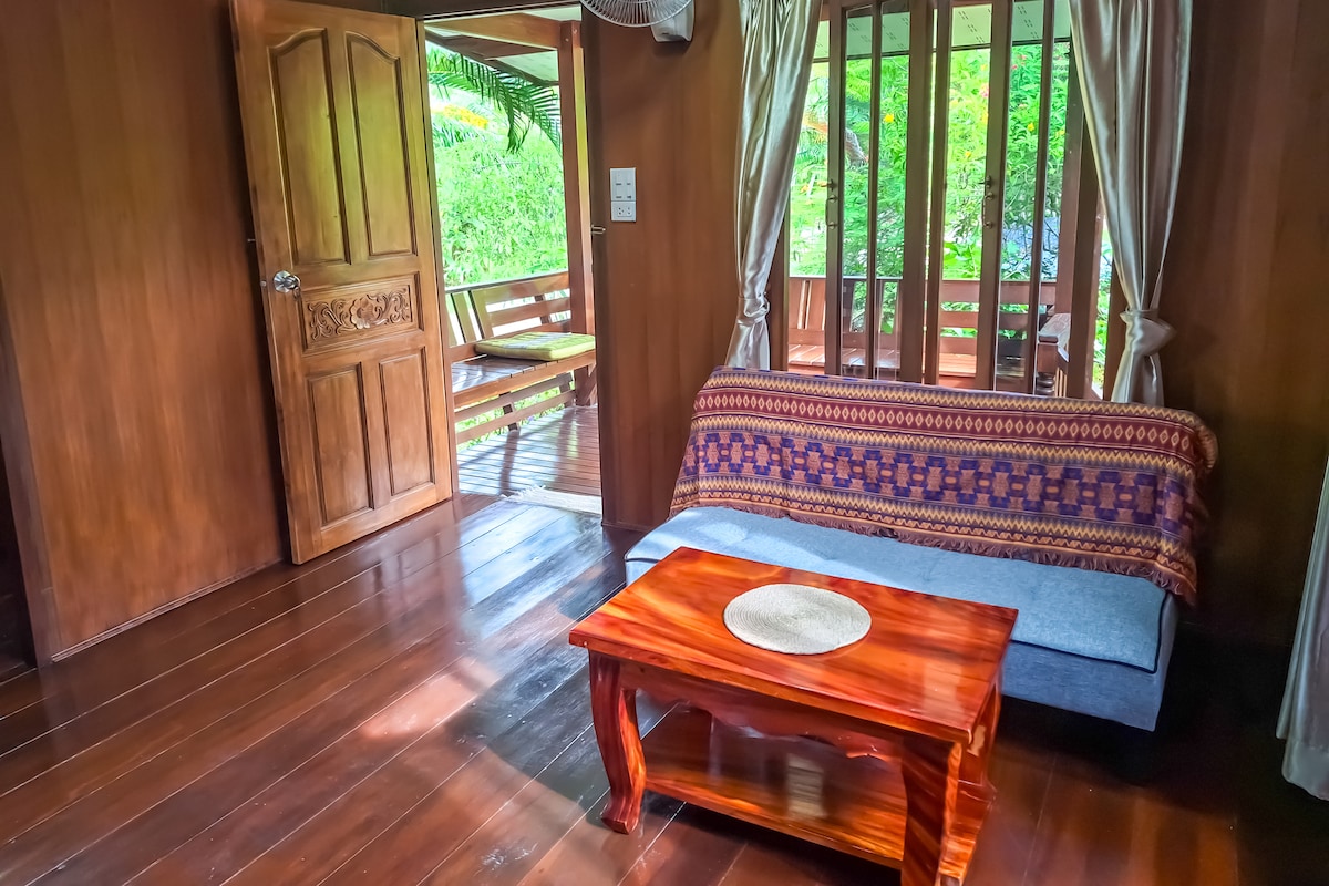 Our funky affordable fan bungalow is surrounded by nature, amongst tropical gardens right next to the sea. You can enjoy the cooling sea breeze and the stunning evening sunset sea views through the thick mangroves trees. Watch the locals go about their day and feel part of the community. You will also enjoy free access to the swimming pool and weights gym at the resort just a couple of hundred meters along the coast.