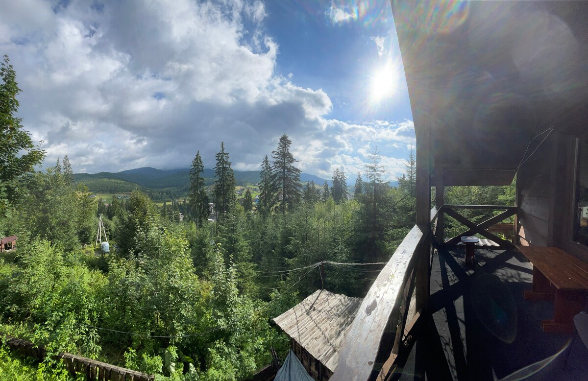 Комфортний дерев’яний будинок в Карпатах, поруч з гірськолижним курортом Буковель. Окремостоячий зруб ручної рубки, простора тераса з чудовим видом на вершини гір Говерла, Петрос, Близниці… Купель з джакузі на відкритому повітрі на нашій терасі- краща заміна сауни. Камін на дрова, теплі підлоги в санузлах, повноцінна кухня з необходною технікою та посудом. На вулиці мангал для приготування страв на вогні. А найголовніше - незабутня атмосфера, усамітнення, краса та комфорт.