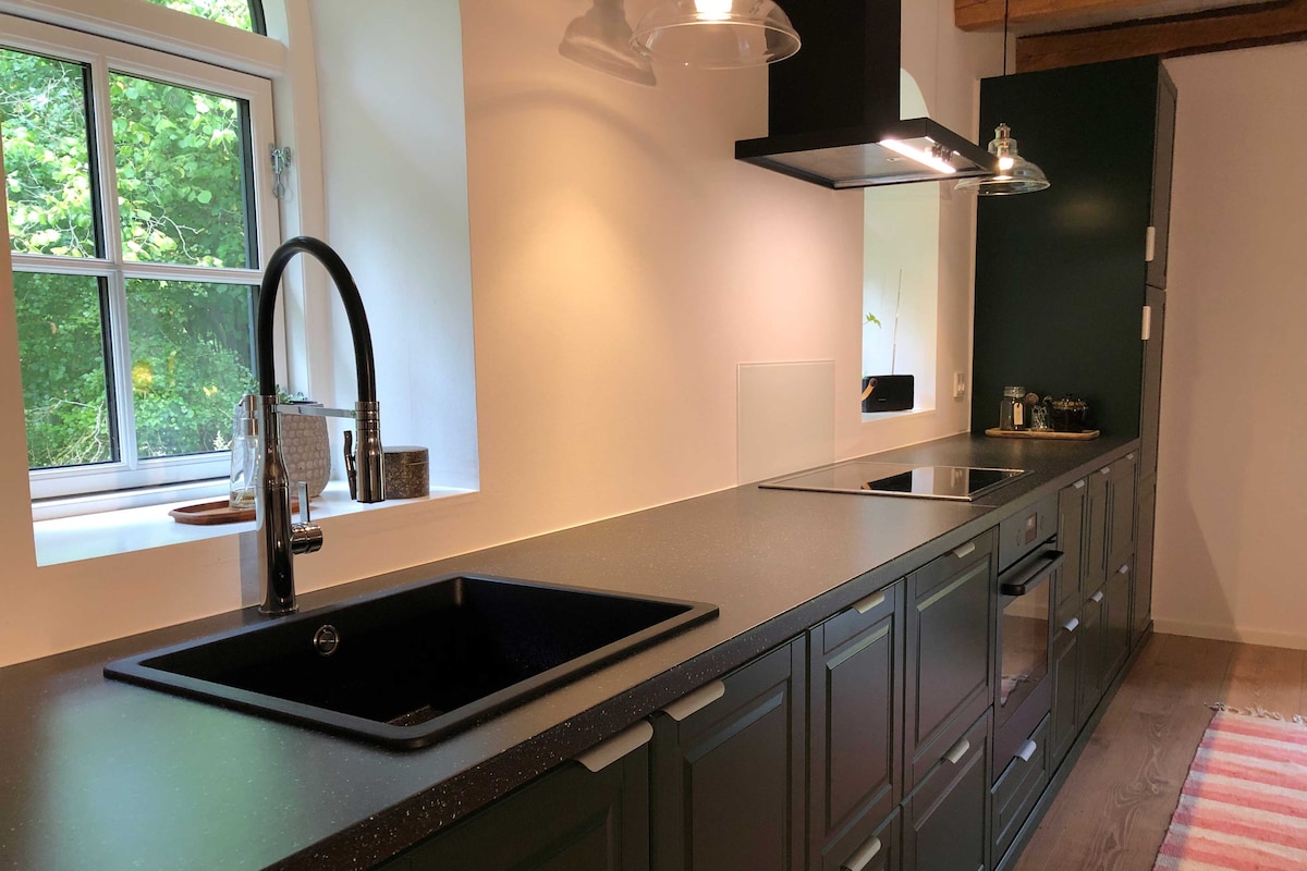 Close to the large forest area at Gjorslev Manor is "Bakkeskov", which is a beautiful and cozy 4-wing farm. The guest house is in the original barn building, which, after a thorough renovation, has achieved a fantastic transformation. Visible beams and idyllic stable windows preserve the authentic look of a former barn. In the 78 m2, there is both a cozy sleeping area with a double bed /B:180 cm, as well as an open kitchen-living room environment, as well as a modern bathroom with shower.