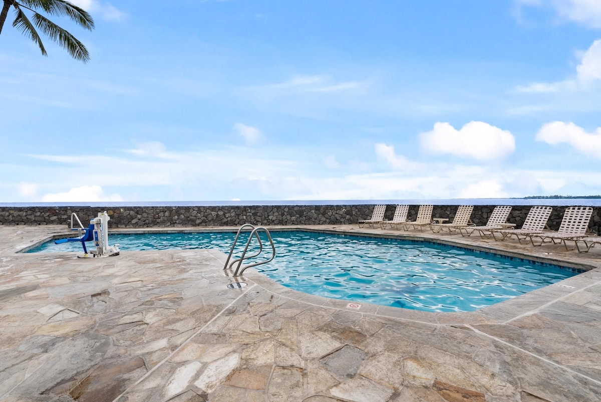 🌊Absolute direct oceanfront top floor, two-bedroom condo located in the heart of Kailua-Kona, Hawaii. Step inside to stunning ocean views from floor-to-ceiling windows and your private oceanfront balcony — welcome to paradise! 🌴 🌬AC in all spaces, elevator access (zero steps!), fully updated with high-quality furnishings throughout. From the balcony, watch sea turtles in the tide pools below, spot dolphins just offshore, and enjoy spectacular sunsets — all just steps from the ocean.