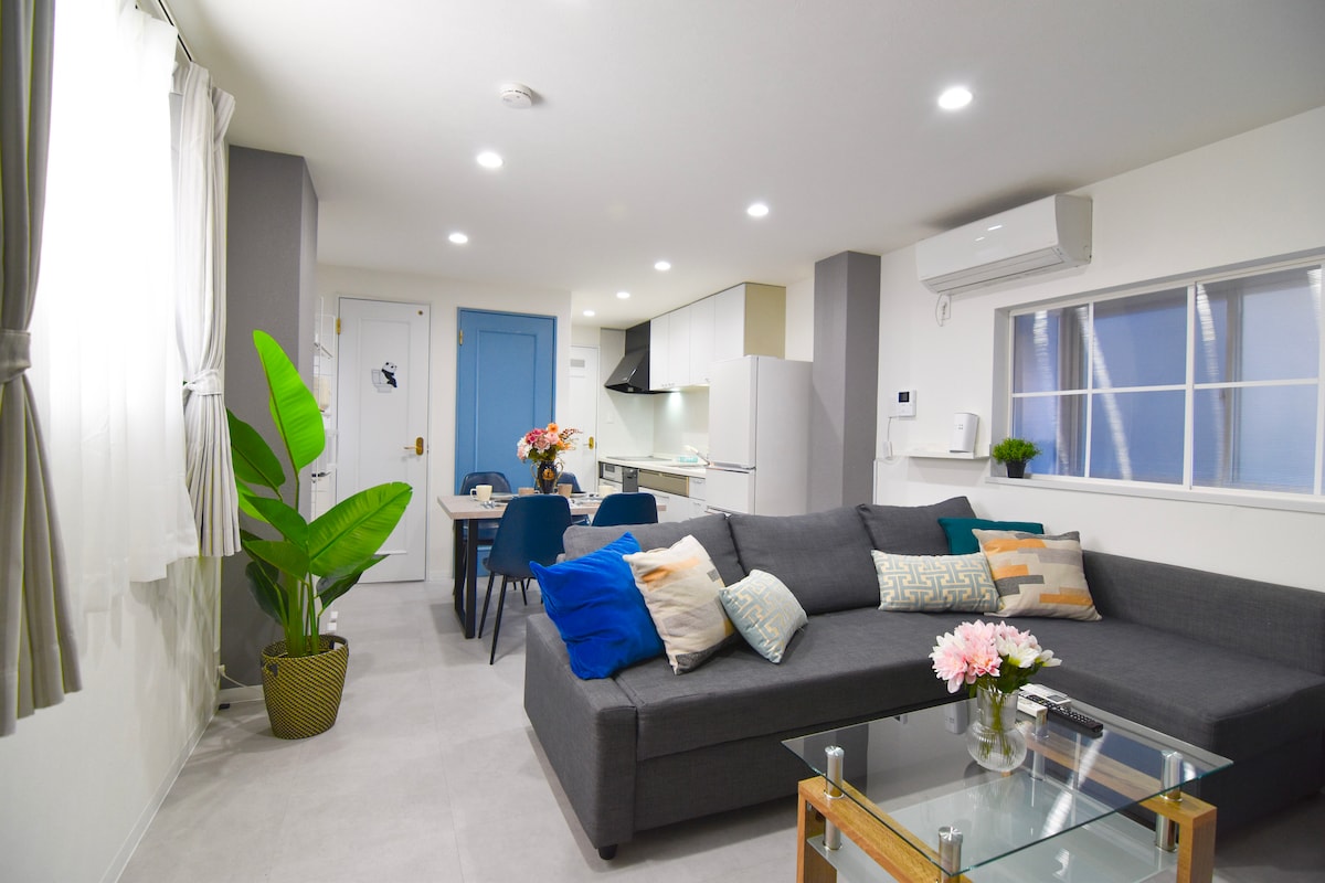 This is a designer apartment room with a garden sofa on the Wooddeck in the center of Namba Relax and watch NETFLIX or YOUTUBE on our 50-inch 4K TV. Since it is in the downtown area, there are various restaurants, Bic Camera(large electronics store), convenience stores, and supermarkets within a few minutes walk, so you can enjoy a comfortable trip♪ 2 minutes walk to subway Nippombashi station 3-4 minutes walk to subway Namba Station 5 minutes walk to Dotonbori 3 minutes walk to Kuromon Market