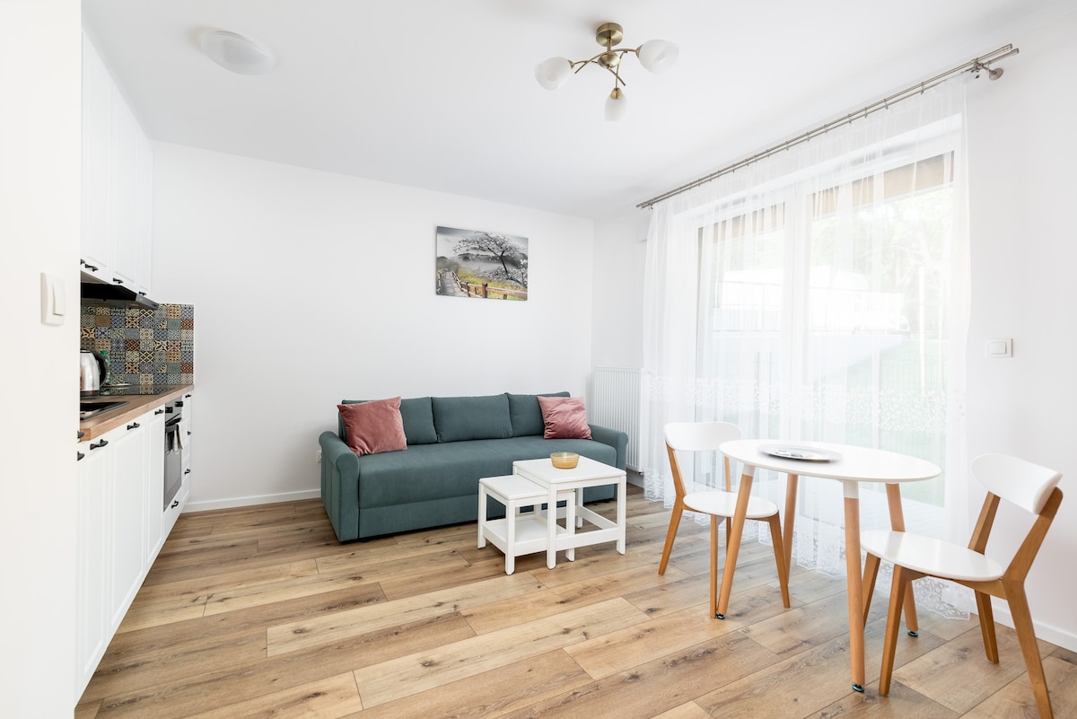 The apartment on the 1st floor for exclusive use provides comfort and intimacy. It consists of a bedroom with a comfortable bed and a sofa bed in the living room, perfect for couples, families and friends. The fully equipped kitchen allows you to prepare meals, and the dining area is conducive to spending time together. The modern bathroom provides everyday comfort, and the balcony is the perfect place to relax with your morning coffee. In addition, there is access to a shared garden with a barbecue area. We invite you to a successful holiday