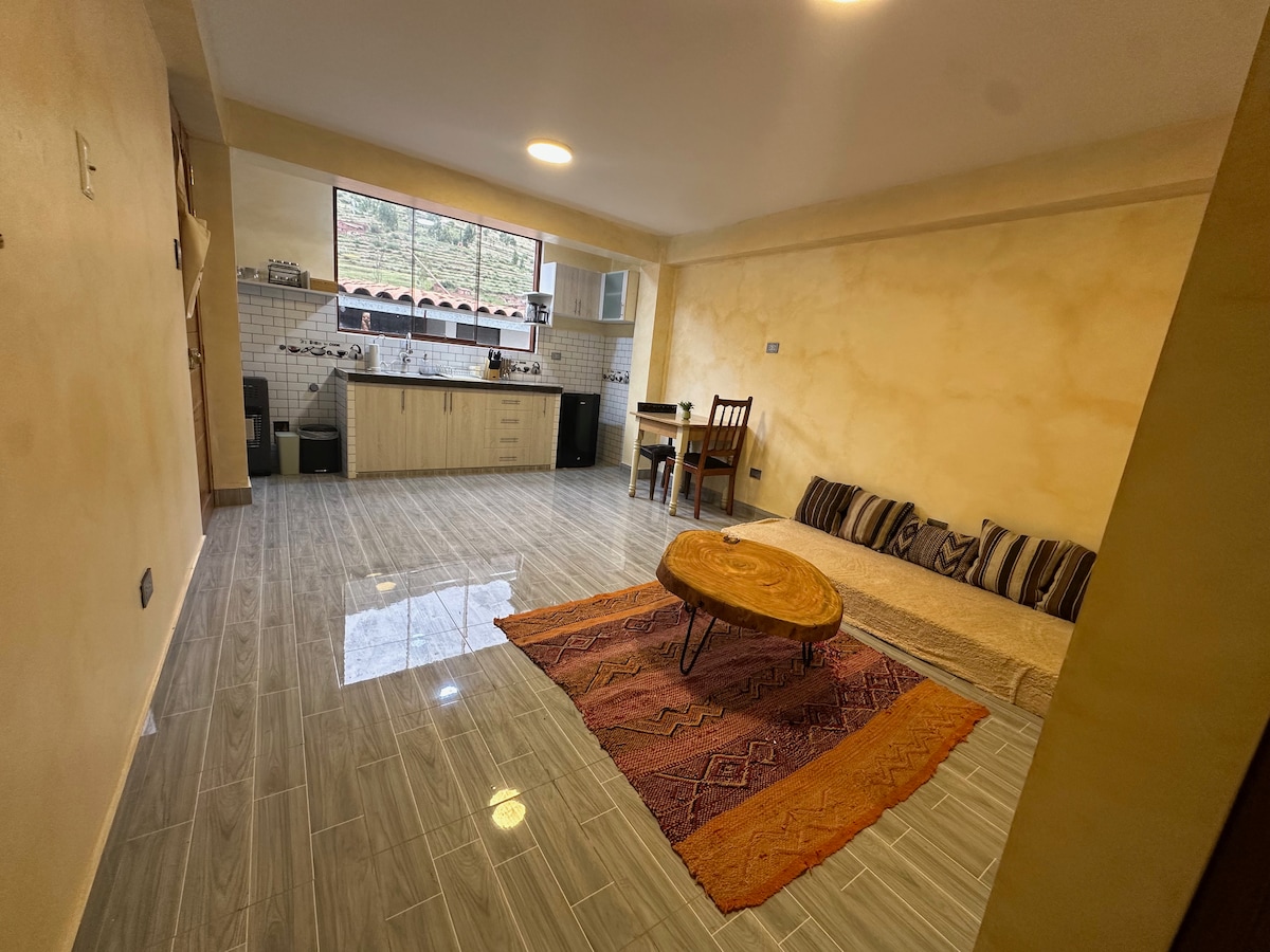 Rustico, moderno y acogedor apartamento de dos habitaciones, 2 baños completos con sistema de agua caliente a gas, inclusive en grifos de cocina, decorado cálidamente para tener una estadía plena donde todo funcione perfectamente, ubicado a 2 cuadras de la plaza principal Pisac, pero en su interior muy tranquilo y silencioso con calefacción. una motocicleta moderna todo terreno de 6 velocidades a precio especial para nuestros huéspedes Servicio de taxi privado desde el aeropuerto a todo el valle