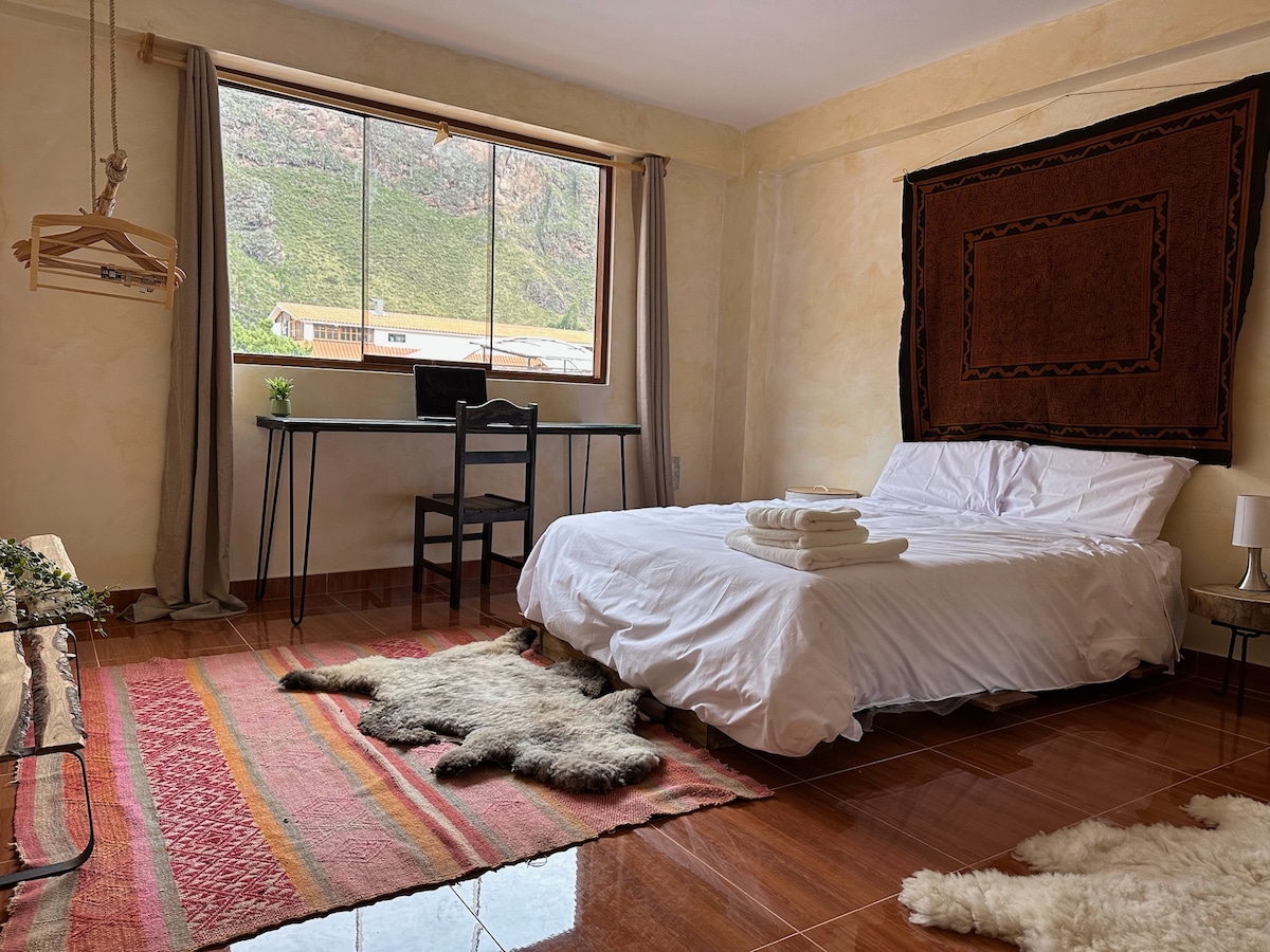 Spacious, thoughtfully decorated, second floor unit with stunning mountain and river views and sounds; 7 minute-walk from downtown Pisac. Comfortable living room with office and dining areas. Beds have pillowtop mattresses, memory foam and microfiber pillows, and alpaca blankets. Complete kitchen. Enclosed common area patio with kitchen and bathroom. Incredible original murals and artwork inside and outside by renowned Shipibo artists provide energetic and spiritual activations.